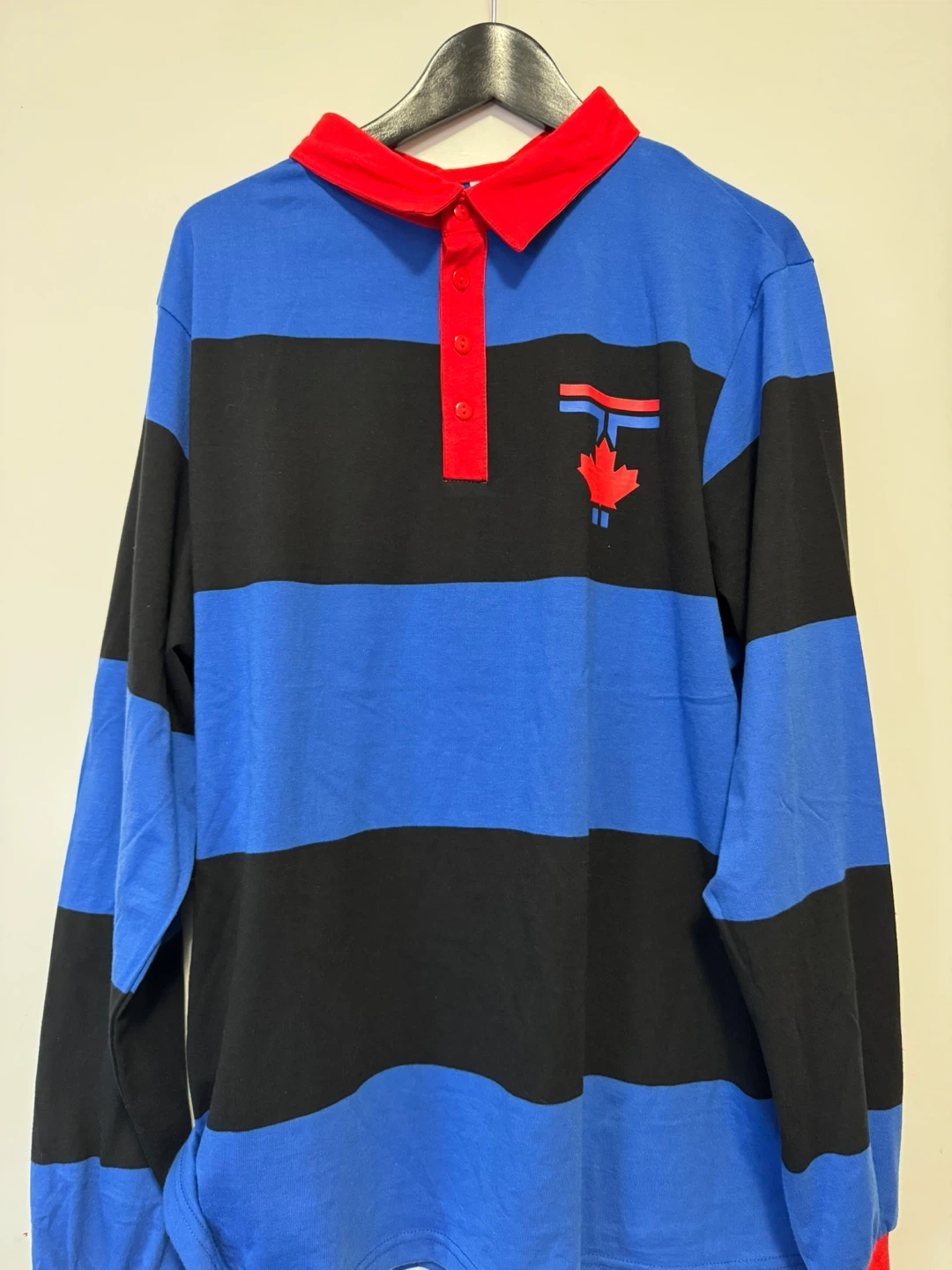Selling a brand new, never worn Blue Jays rugby shirt, size XL. It features a blue, black, and red colour scheme. The shirt has a long-sleeved design and a classic rugby collar. Perfect for casual wear or showing your Canadian pride. It was from the game on Friday, September 26, 2025