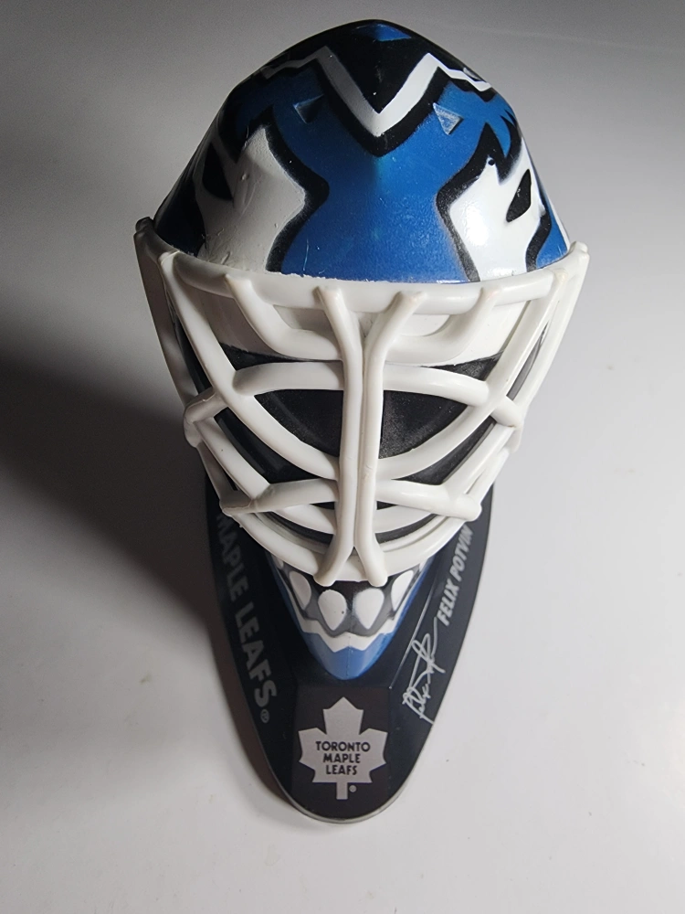 137Selling a Toronto Maple Leafs goalie mask figurine featuring Felix Potvin. It's in good condition and would be a great addition to any Leafs fan's collection