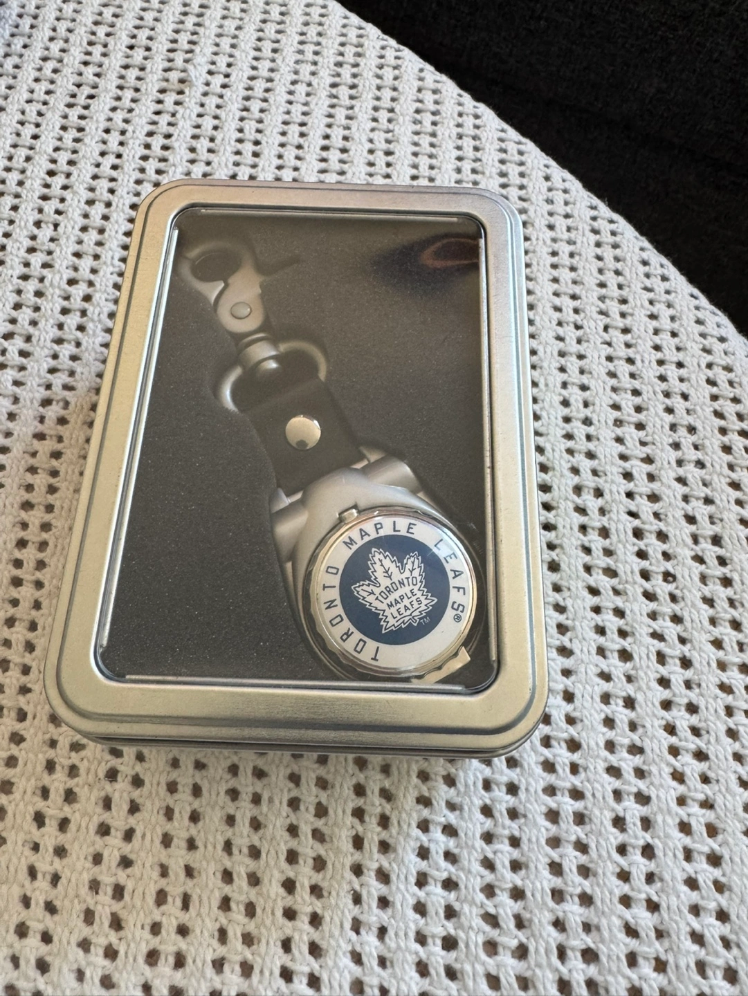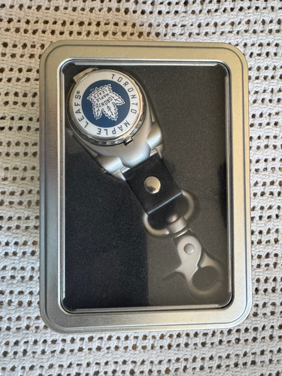 72Keychain watch featuring the Toronto Maple Leafs logo. Comes in a tin box. Leather strap.