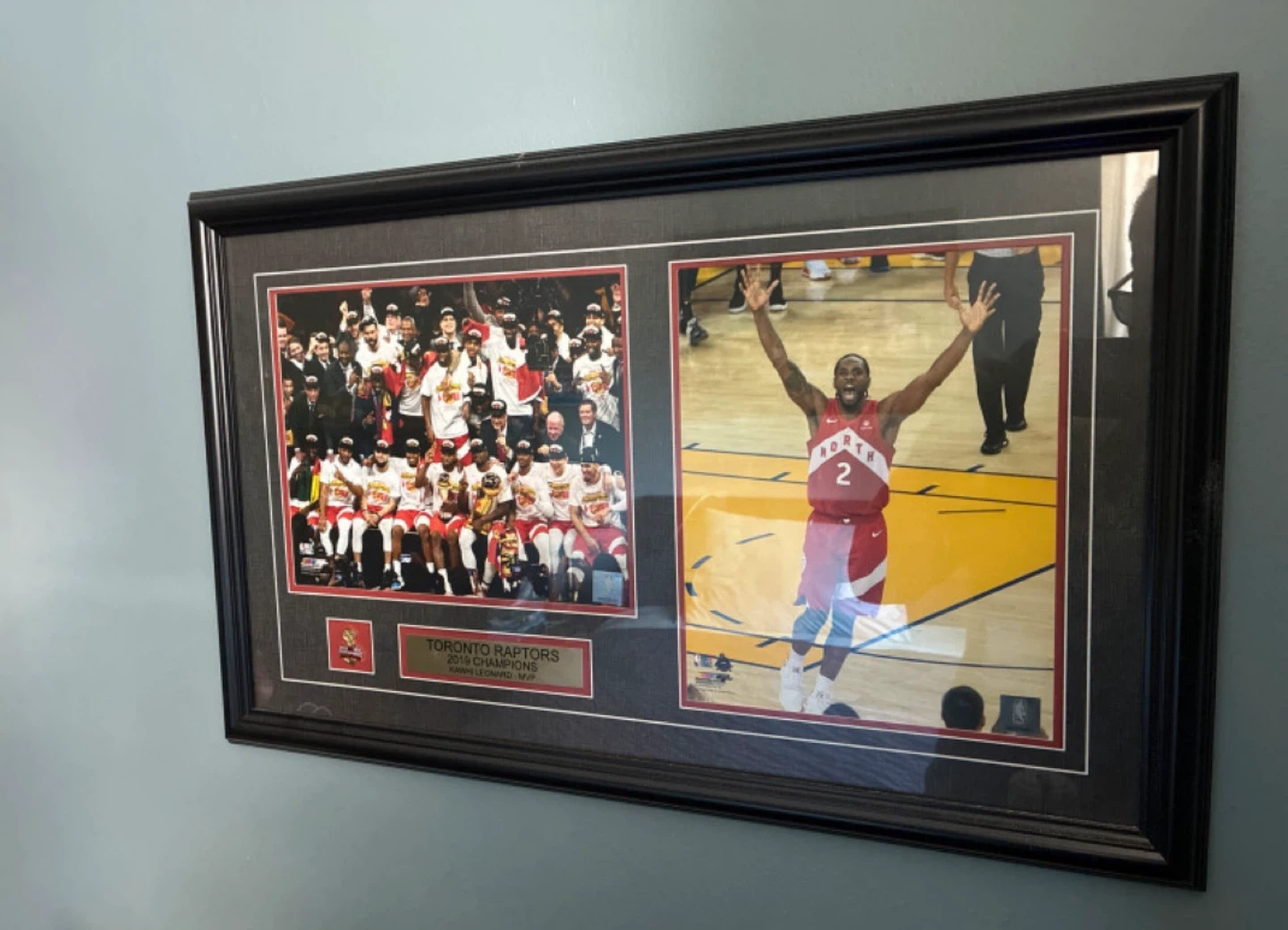15Selling a framed picture commemorating the Toronto Raptors' 2019 NBA Championship win. It includes a pin and a plaque that says 'Toronto Raptors 2019 Champions Kawhi Leonard - MVP'. A great piece for any Raptors fan!