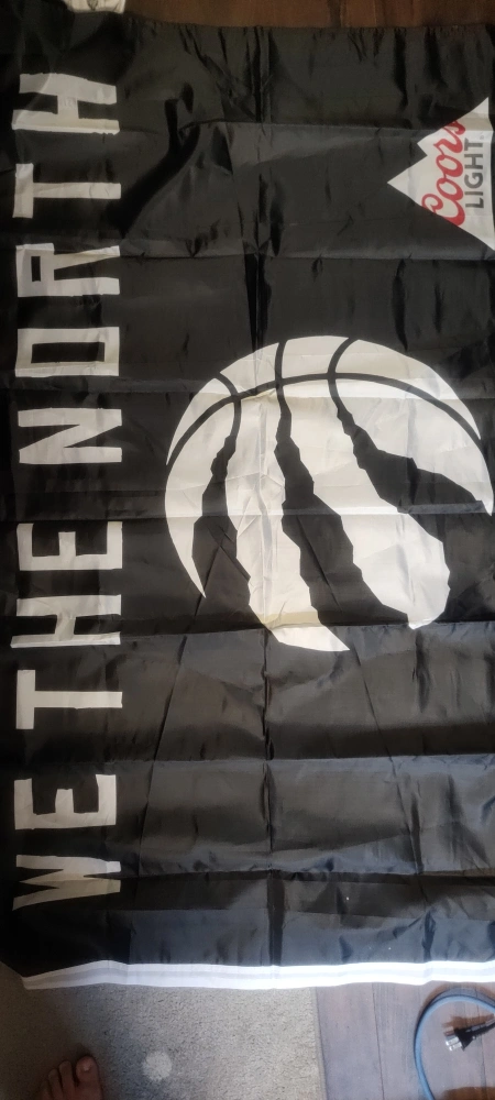 123Large black Toronto Raptors flag. Features team logo and "We The North" text. Coors Light logo also visible. Measures about 90cm by 147cm.