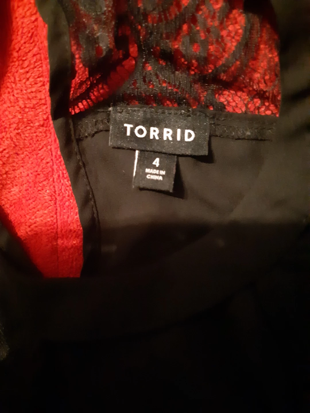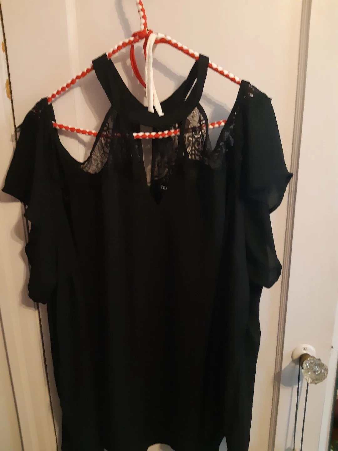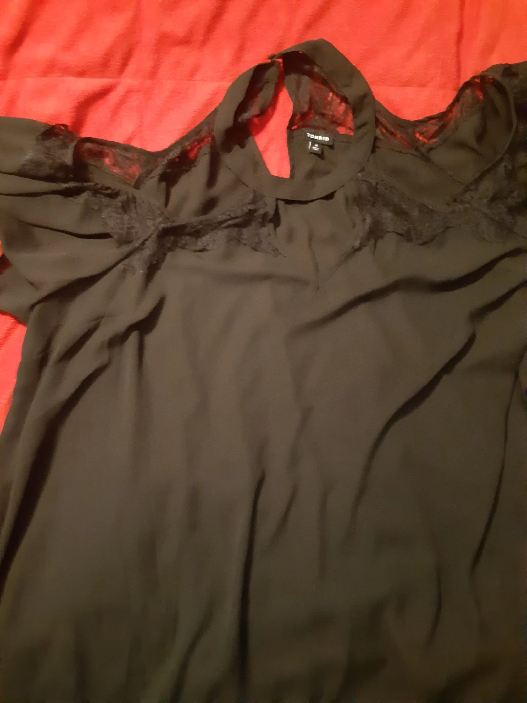 Selling a Torrid black blouse with lace detailing! It's in great condition and is a size 4. Perfect for dressing up or down! so silky and beautiful