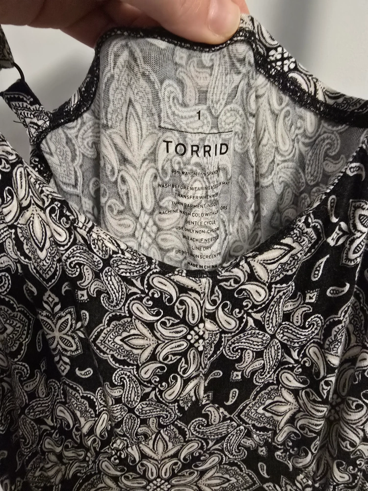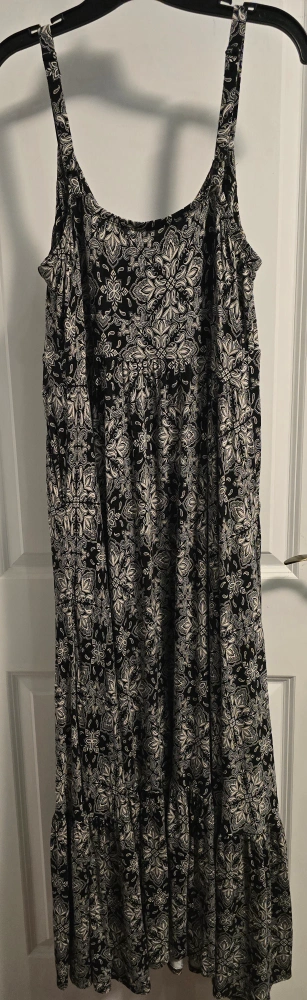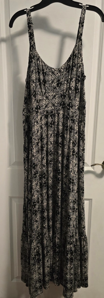 10Selling a Torrid maxi dress in size 1. It features a black and white pattern and is made of 95% rayon and 5% spandex. It's super comfy and perfect for summer!