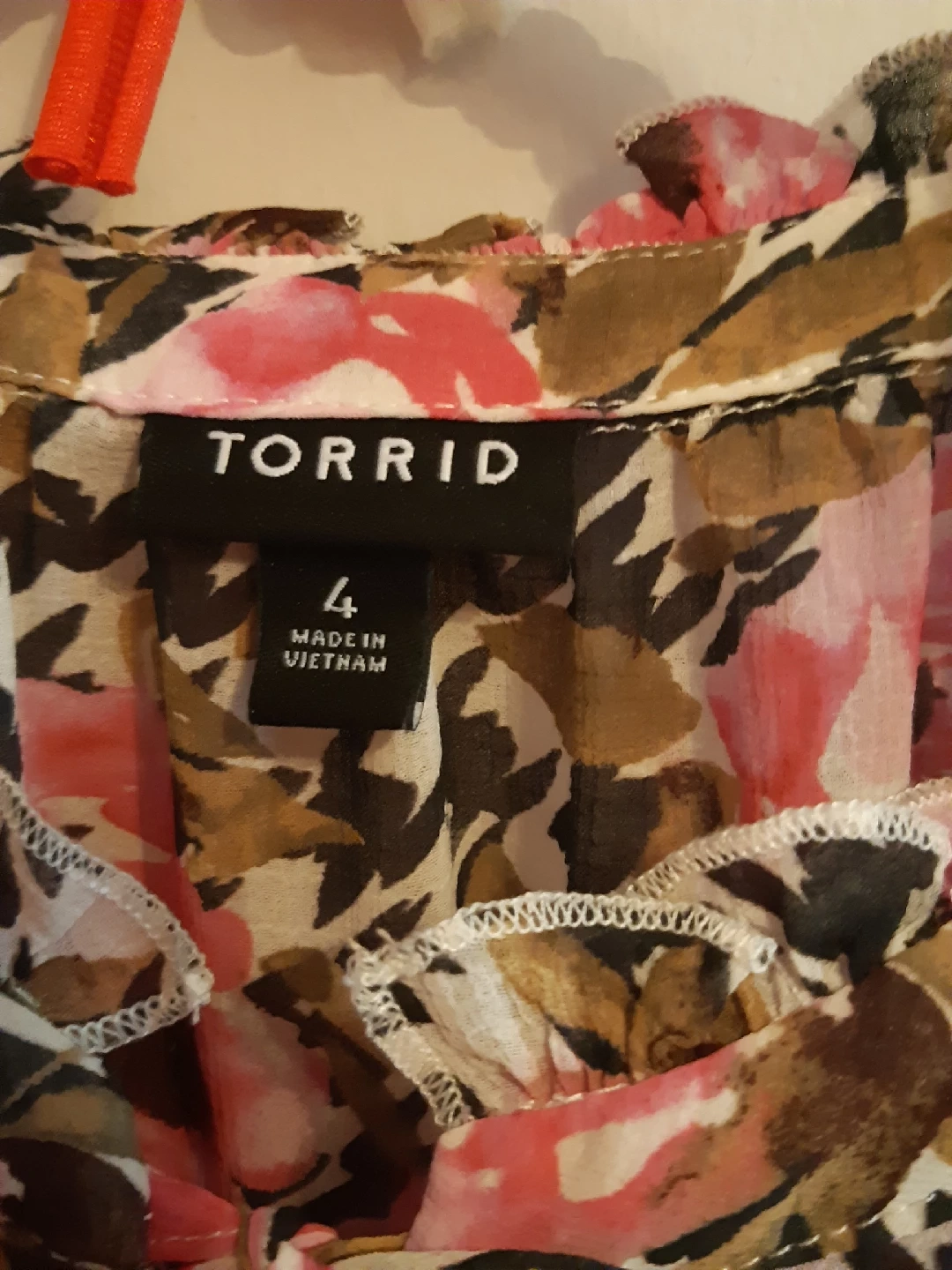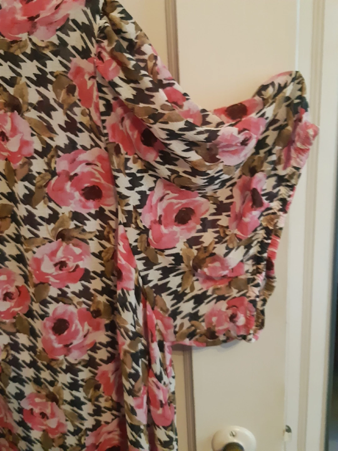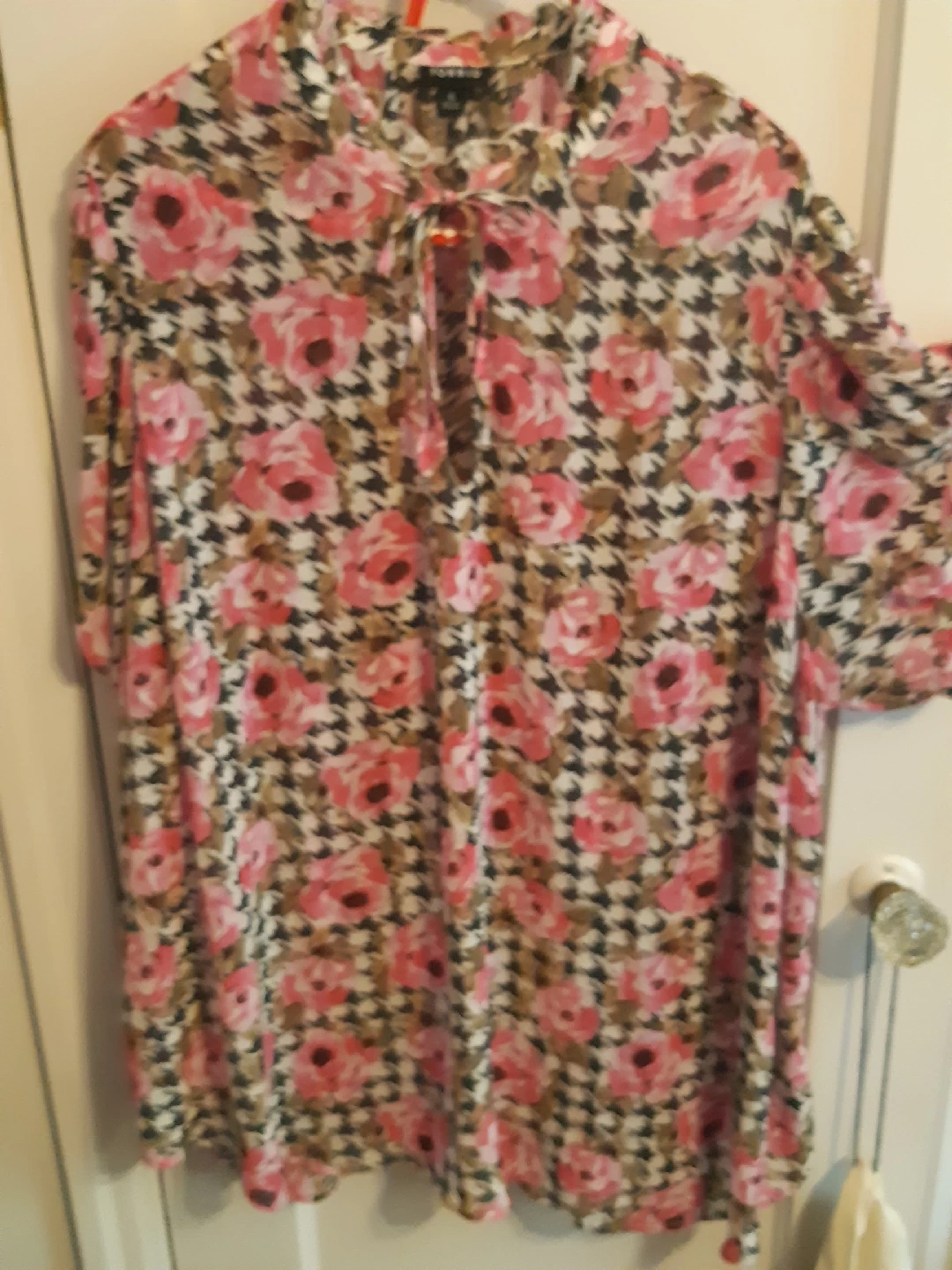 Selling a Torrid blouse in size 4! It features a beautiful floral print with pink roses and a houndstooth pattern. Perfect for adding a touch of style to your wardrobe! This top looks amazing on. The colours are amazing.