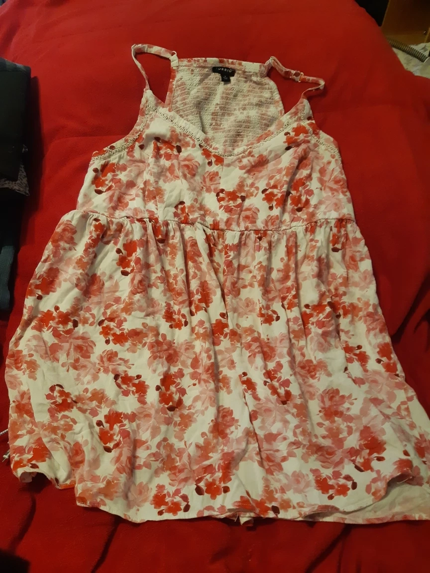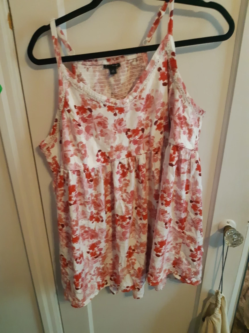 Selling a cute Torrid tank top with a floral print! It's a size 3 and has a lovely design with red and pink flowers on a white background. Perfect for summer days! Looks cute with a little white sweater over it.