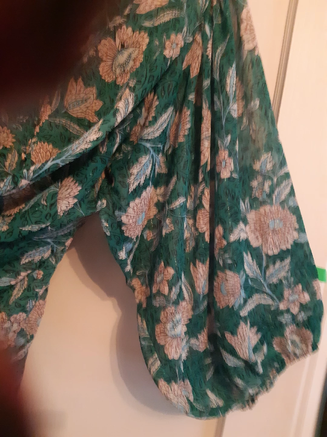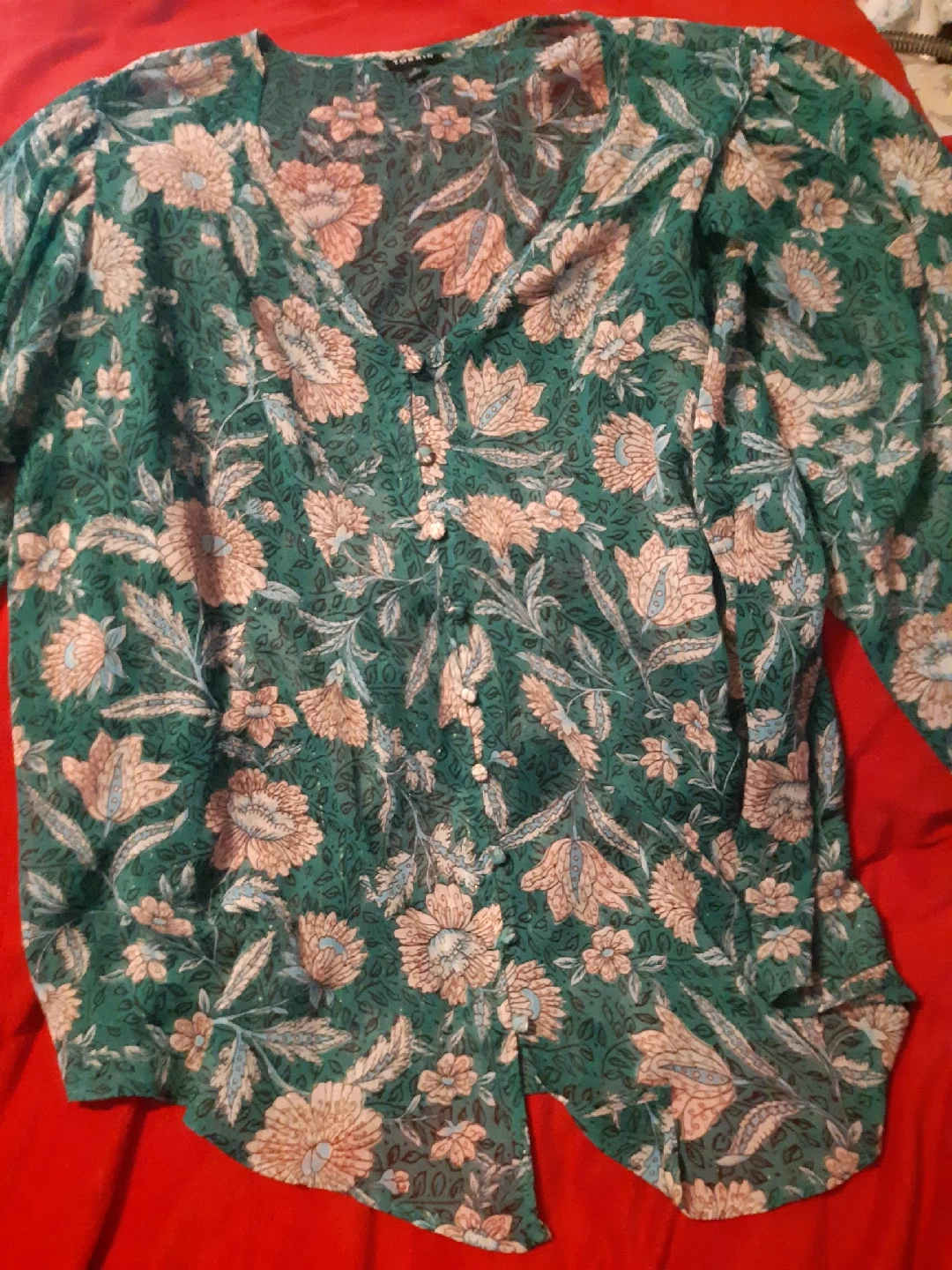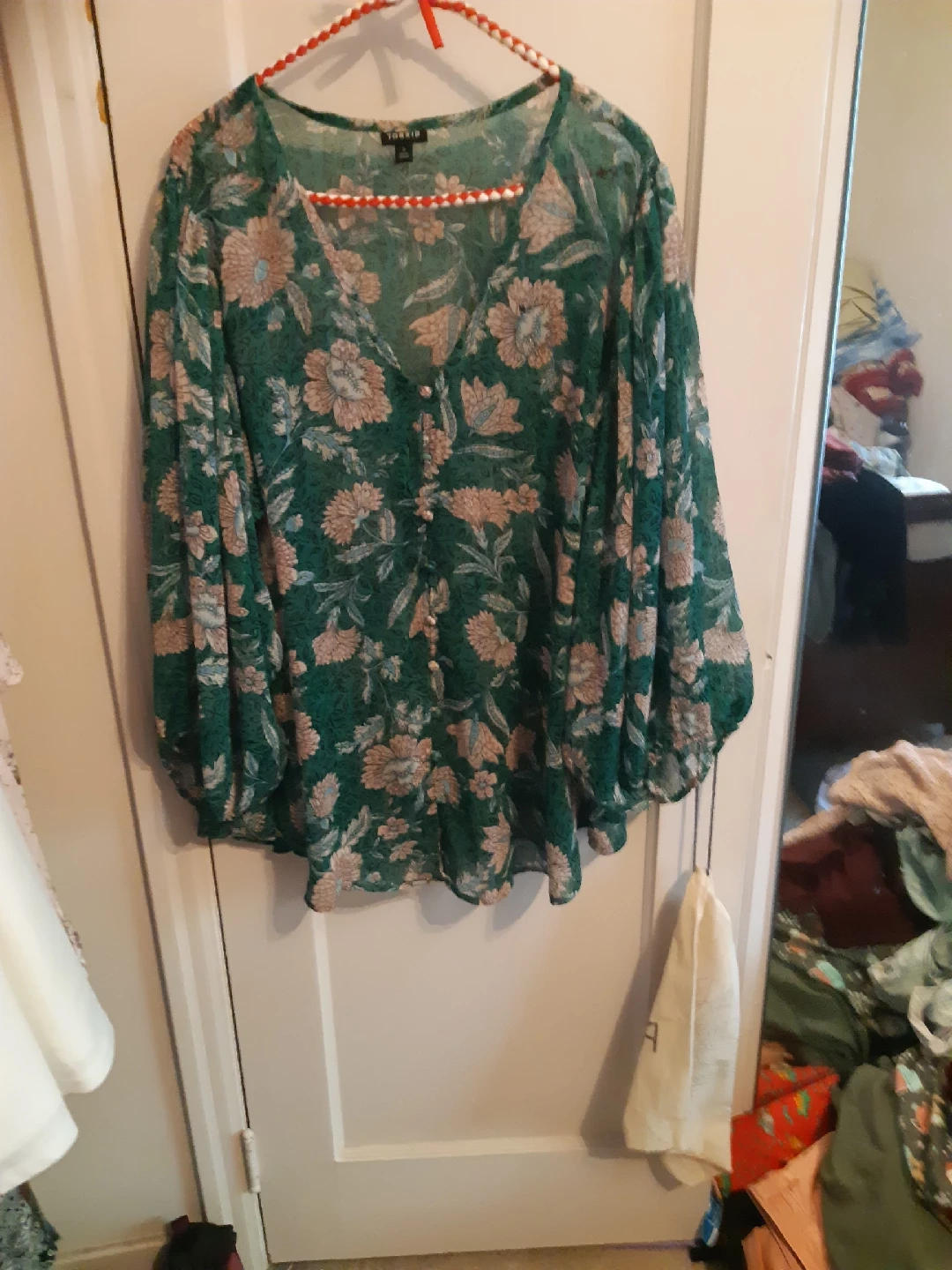 Selling a cute Torrid blouse with a green floral pattern! It has long, flowy sleeves and a v-neck with button details. Perfect for adding a pop of colour to your wardrobe! It looks beautiful on. light and flowing.