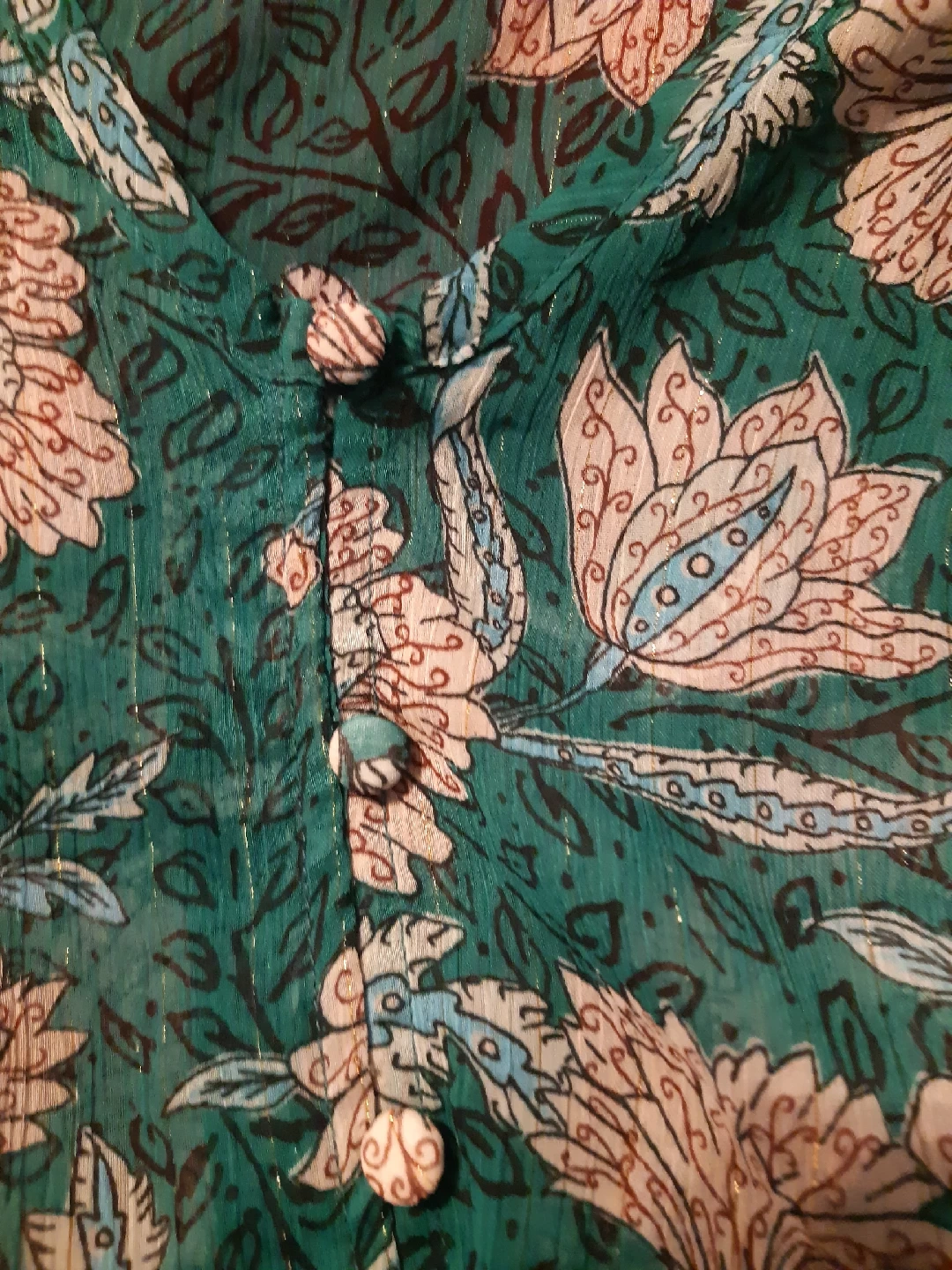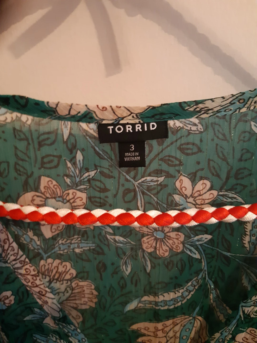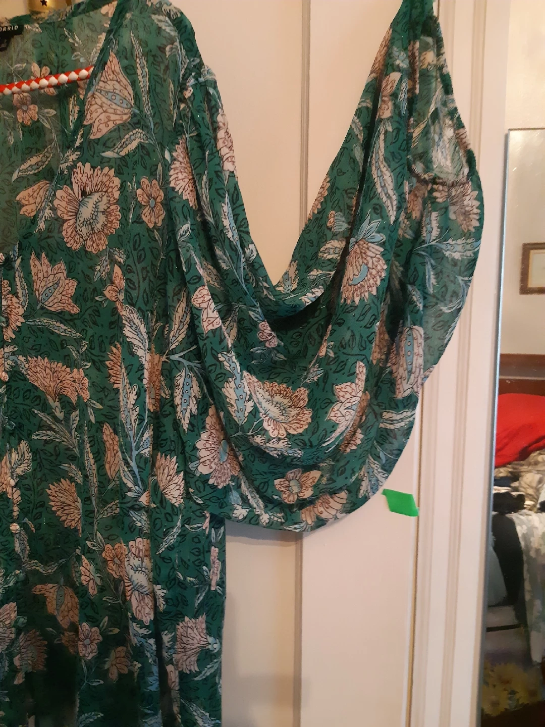 Selling a cute Torrid blouse with a green floral pattern! It has long, flowy sleeves and a v-neck with button details. Perfect for adding a pop of colour to your wardrobe! It looks beautiful on. light and flowing.