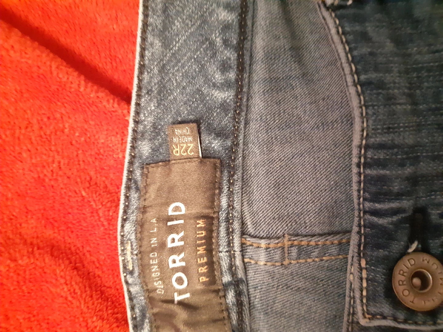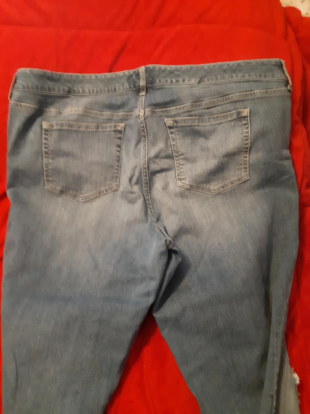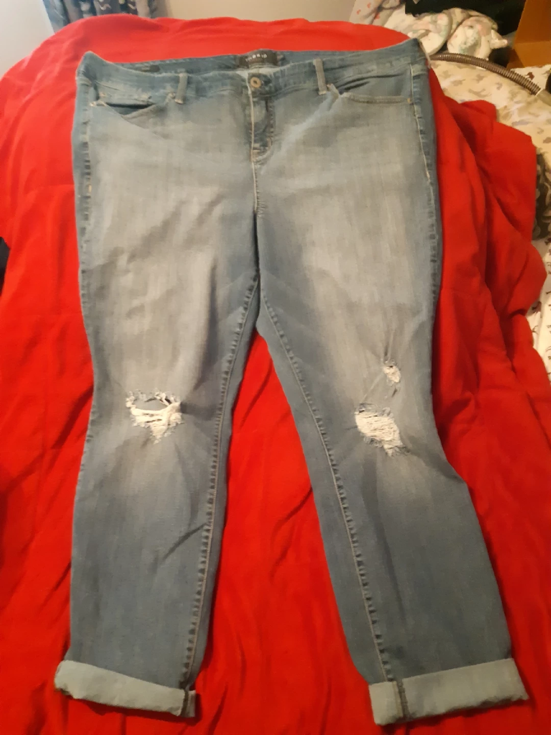 Selling a pair of Torrid skinny jeans in size 22. They're a light wash denim with some stylish rips at the knees. Perfect for a casual look! These jeans fit so nice!!!