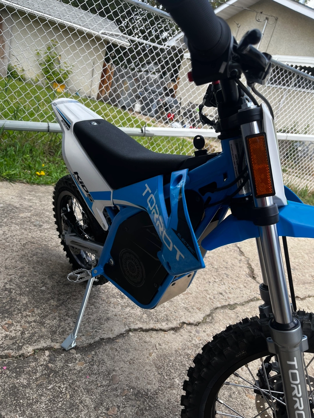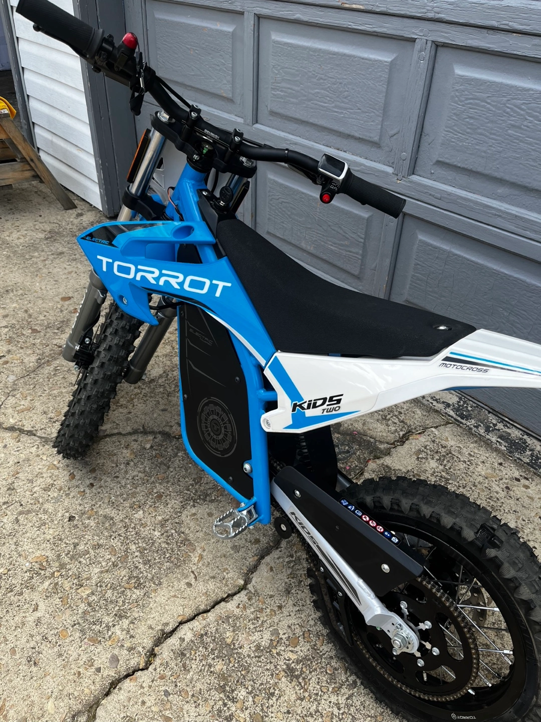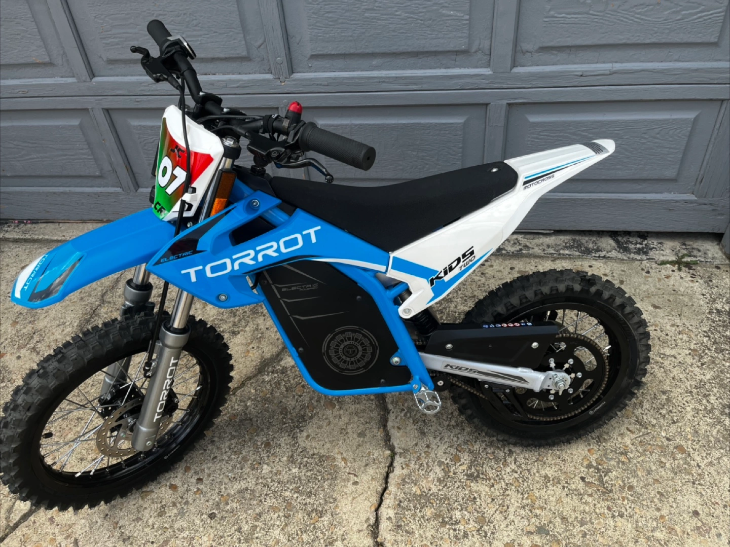 10A blue and white electric dirt bike. Features black tires and a black seat. The bike has a kickstand and is a two-wheeled vehicle. The TORROT branding is on the side. Great for getting some fresh air and practicing your skills.