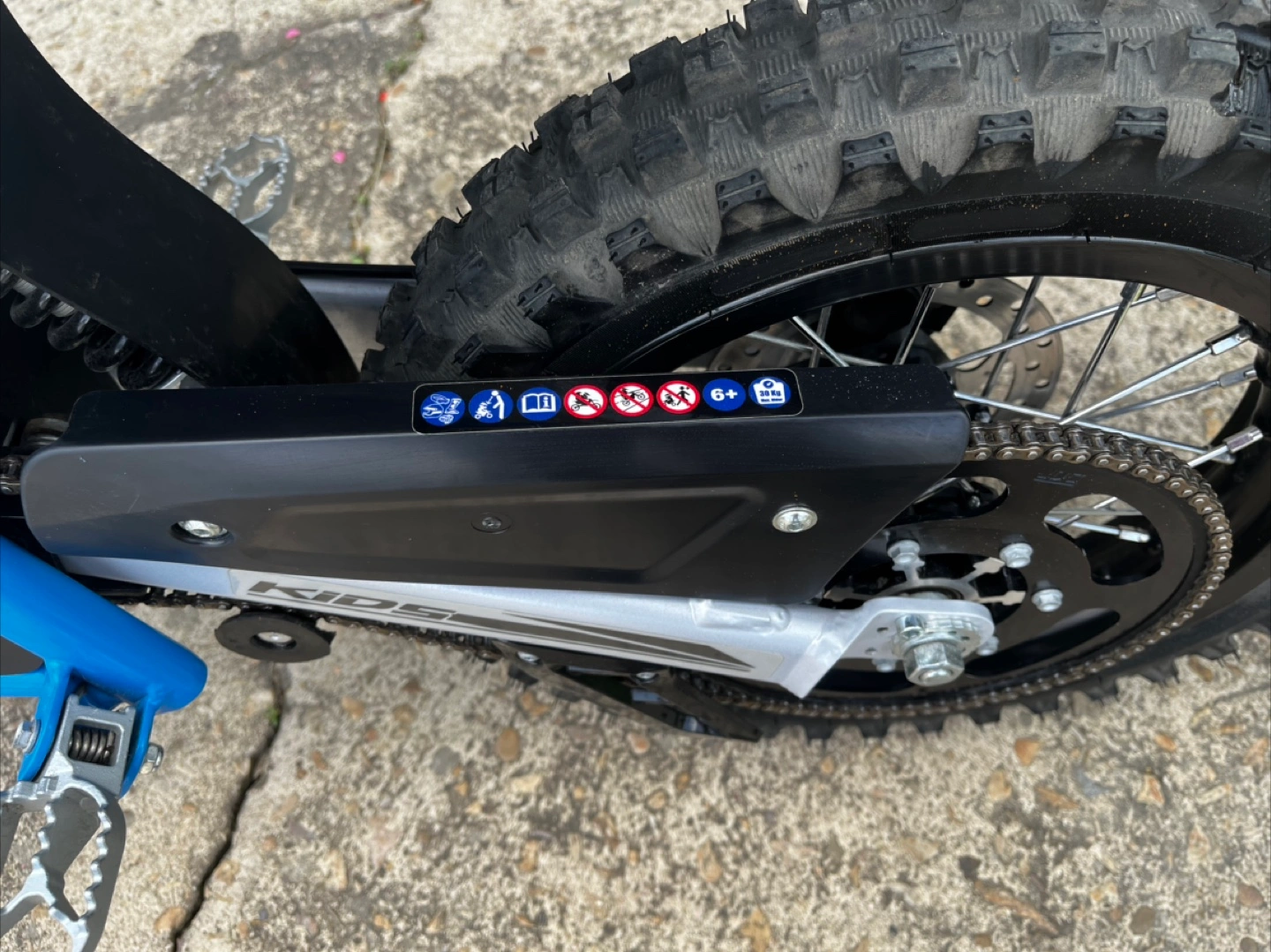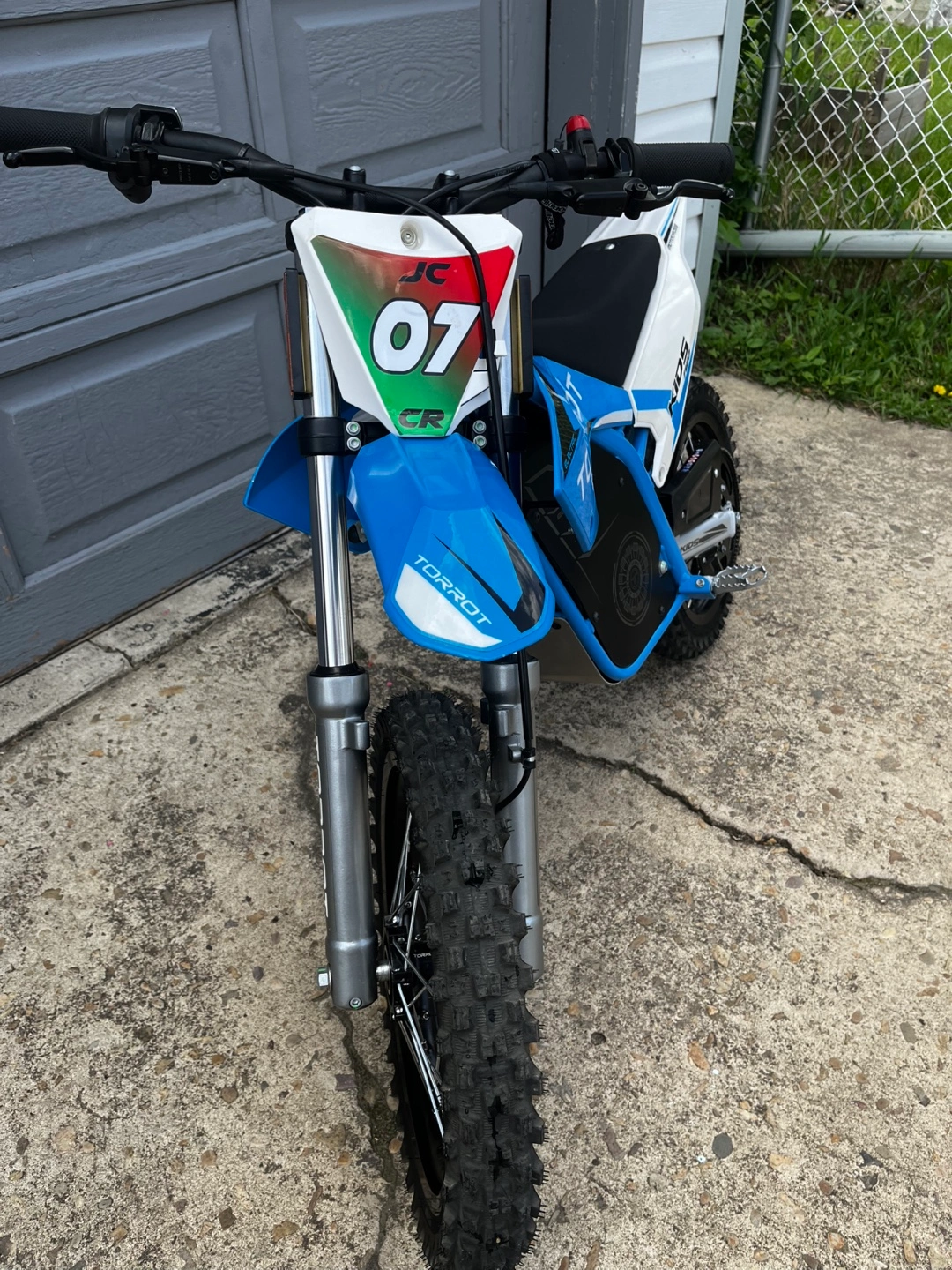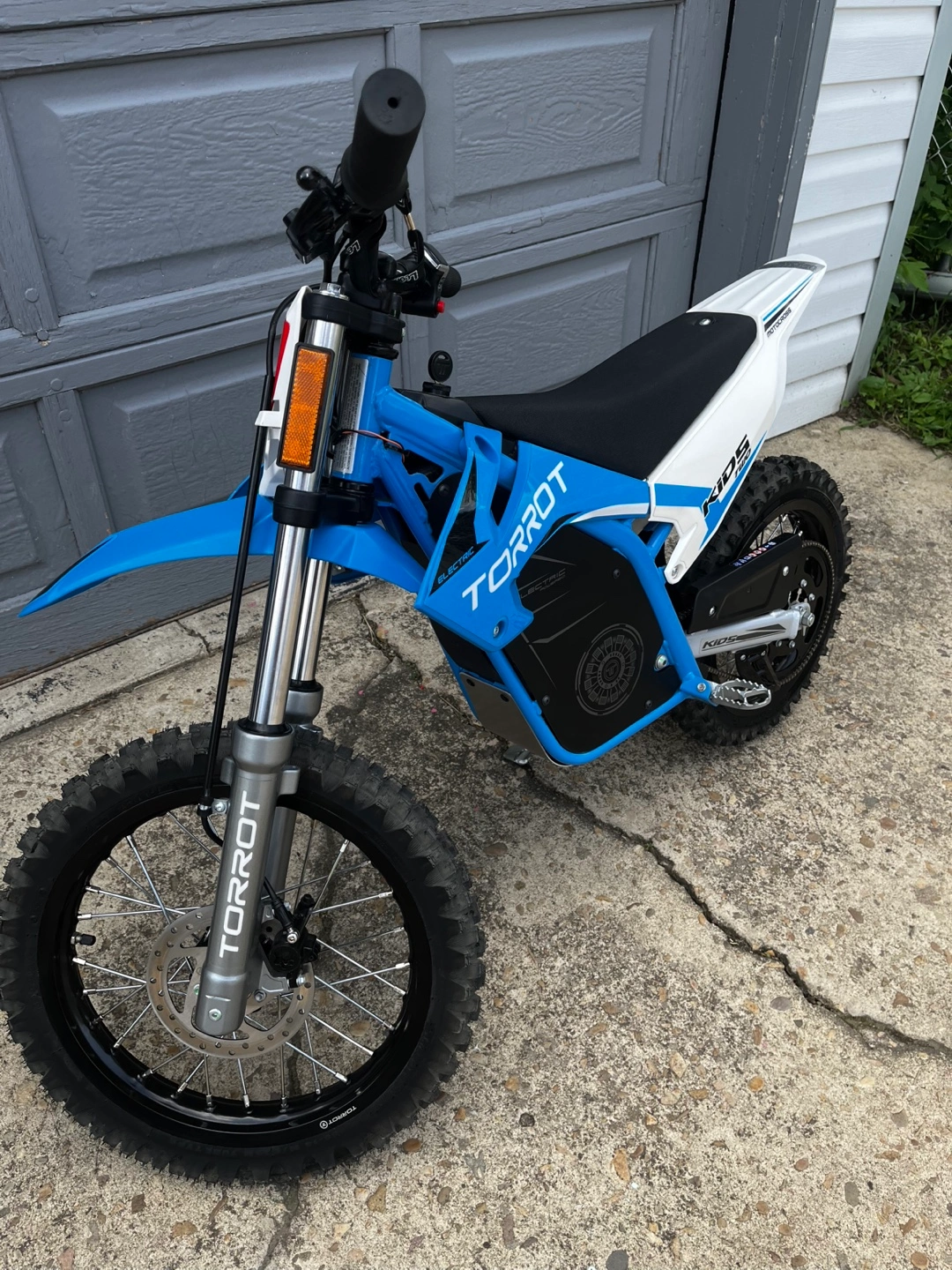 10A blue and white electric dirt bike. Features black tires and a black seat. The bike has a kickstand and is a two-wheeled vehicle. The TORROT branding is on the side. Great for getting some fresh air and practicing your skills.