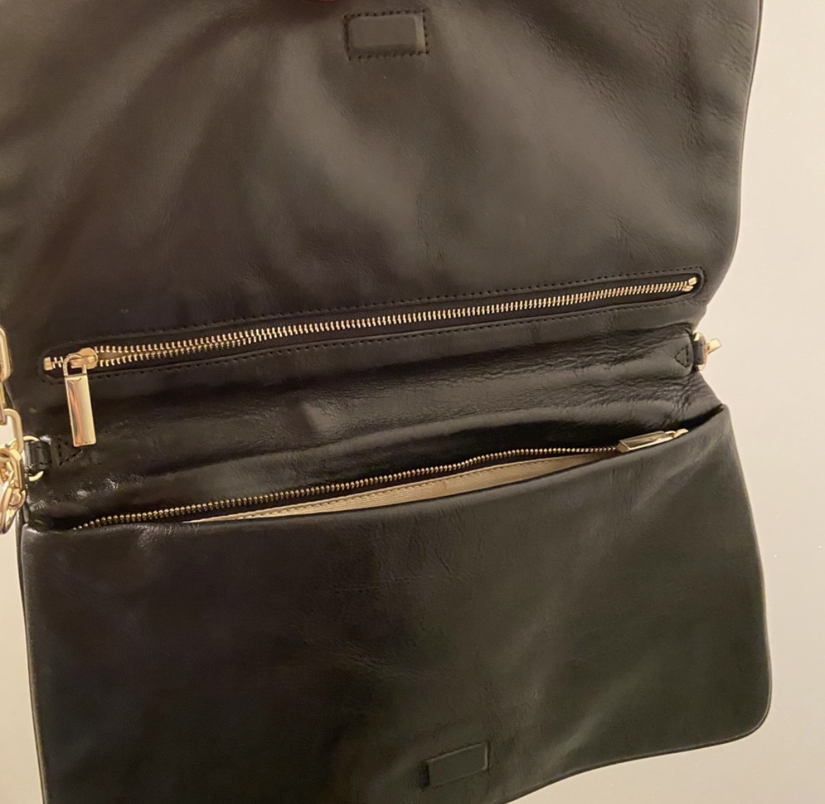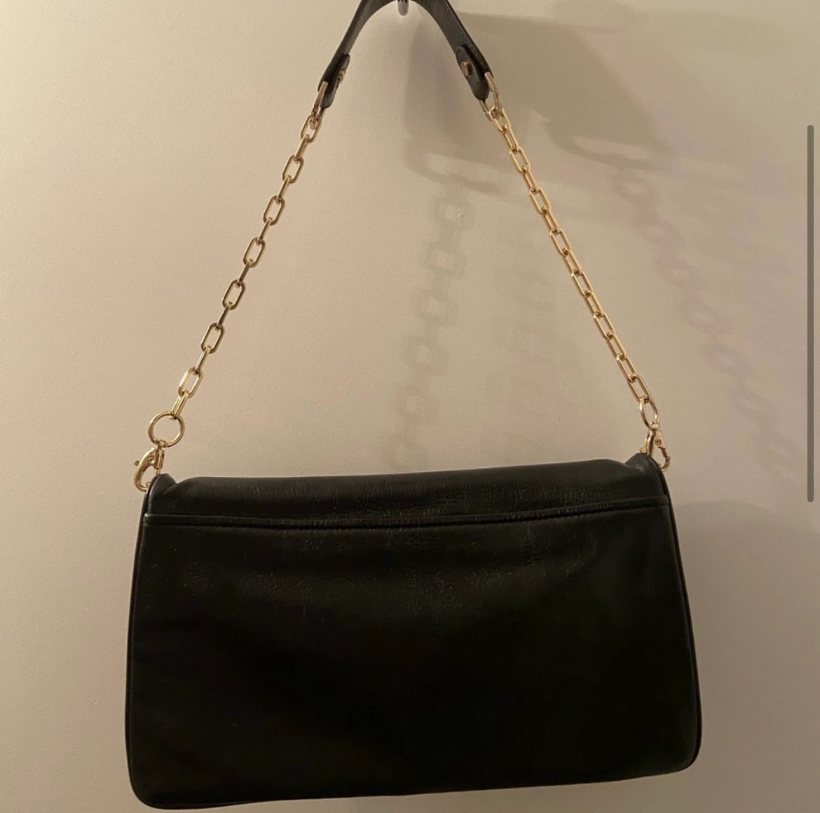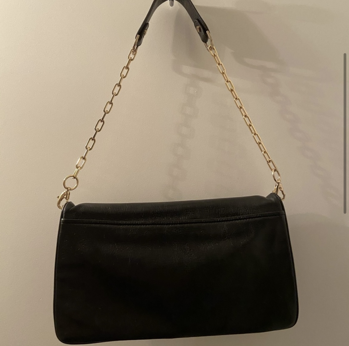 Made from leather with a cutout logo at the center front Link chain strap can be removed to use as clutch Magnetic closure 2 interior zip pockets Original chain short, bag will just fall a few inches under the underarm