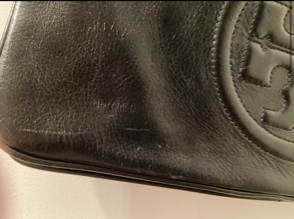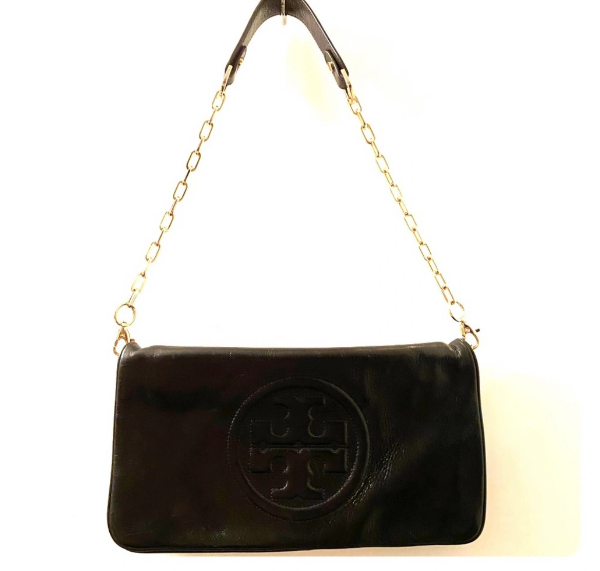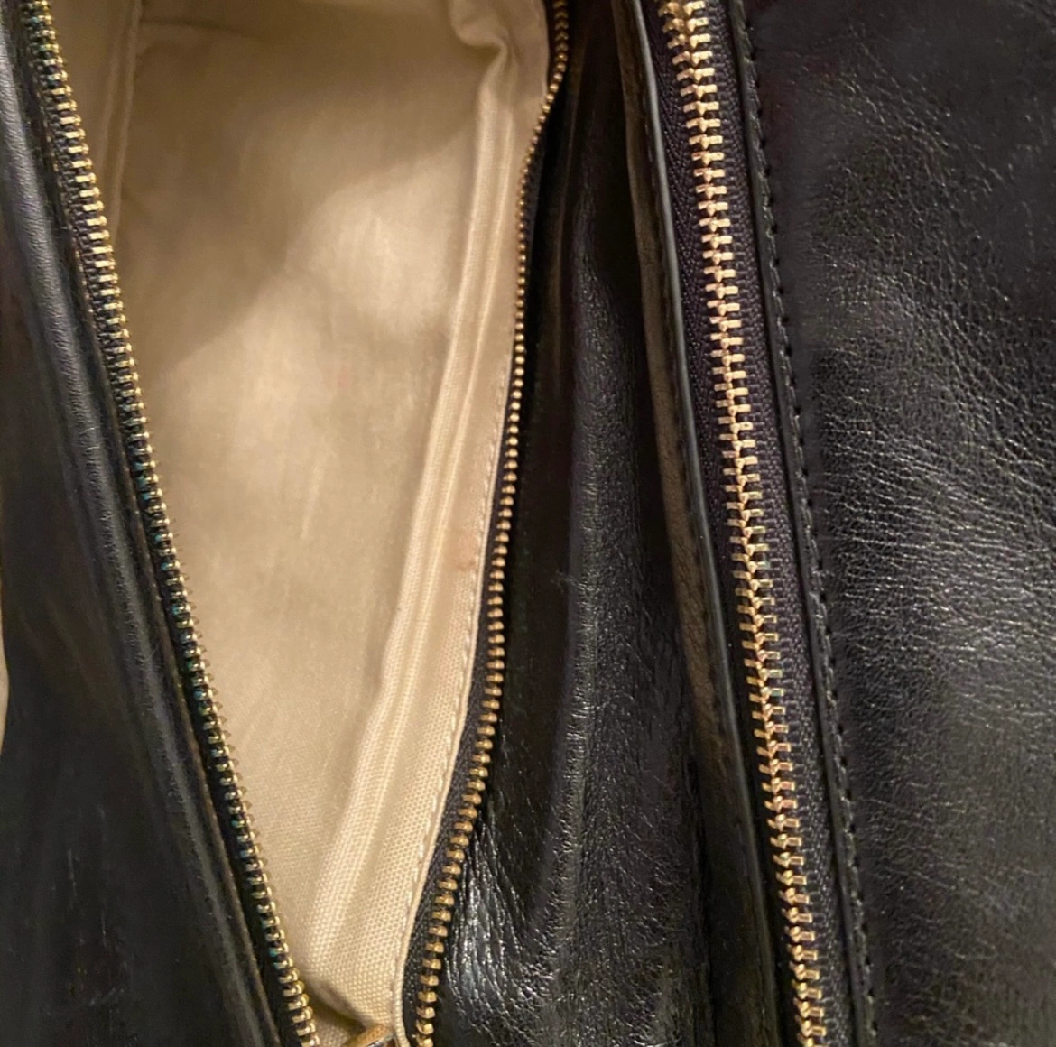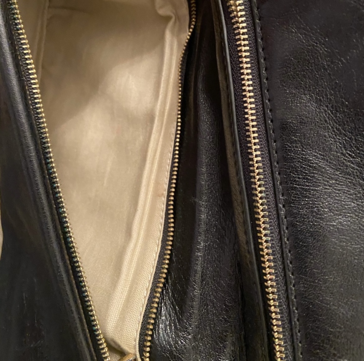Made from leather with a cutout logo at the center front Link chain strap can be removed to use as clutch Magnetic closure 2 interior zip pockets Original chain short, bag will just fall a few inches under the underarm