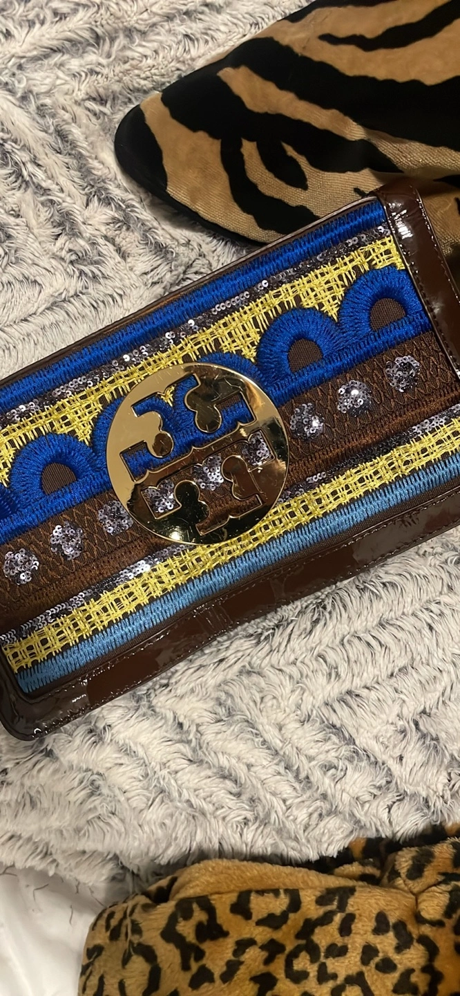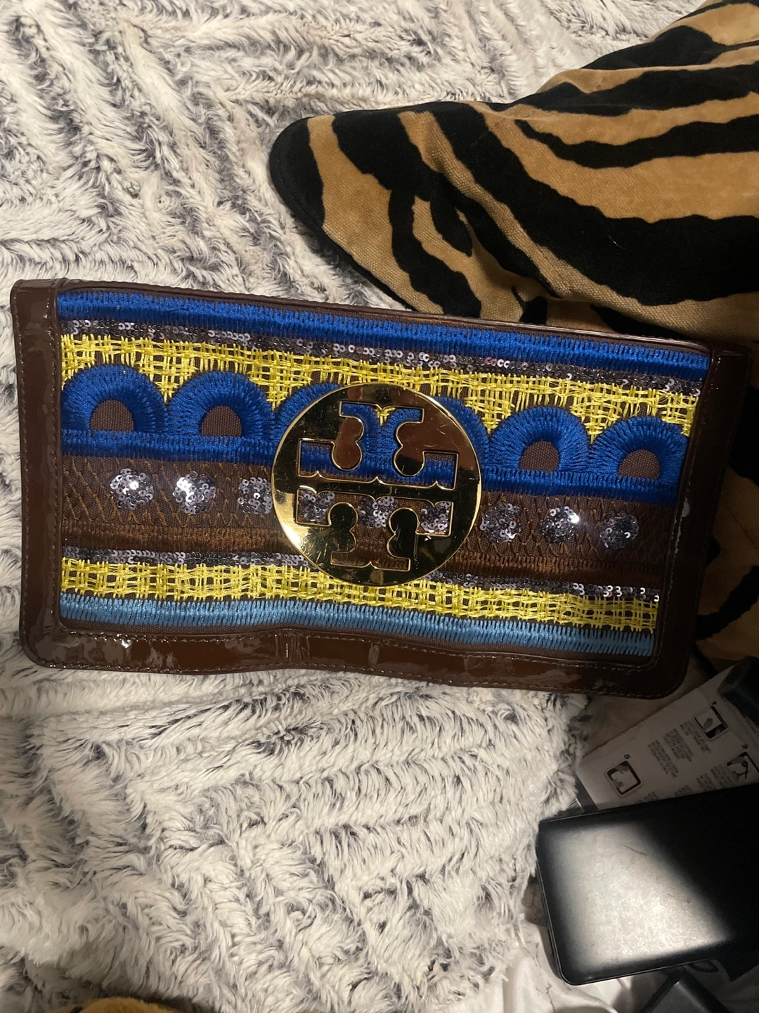 Beautiful Tory Burch clutch. Brown patent leather. Multicoloured embroidered details. Gold-tone logo. Perfect for evenings out.