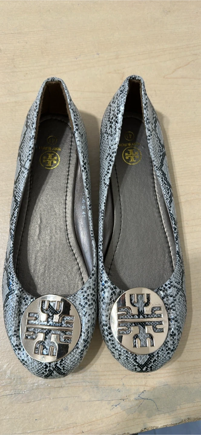 28These are a pair of Tory Burch flats in a snakeskin pattern. They are a women's size 10 (41). They feature the classic Tory Burch logo on the toe.