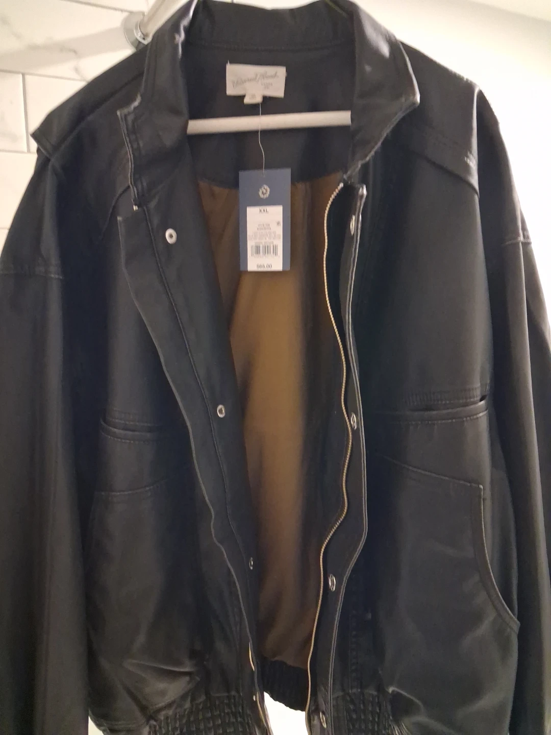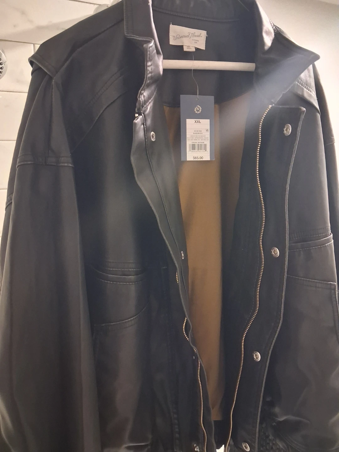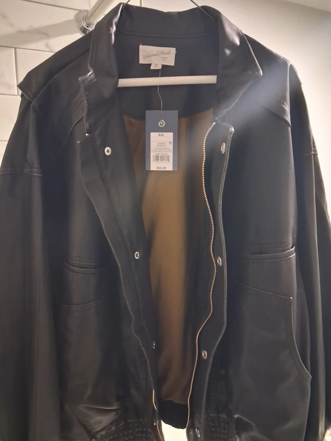 This black faux leather bomber jacket is from Universal Thread. It's a size XXL. Features a zip-up front and snap closures.