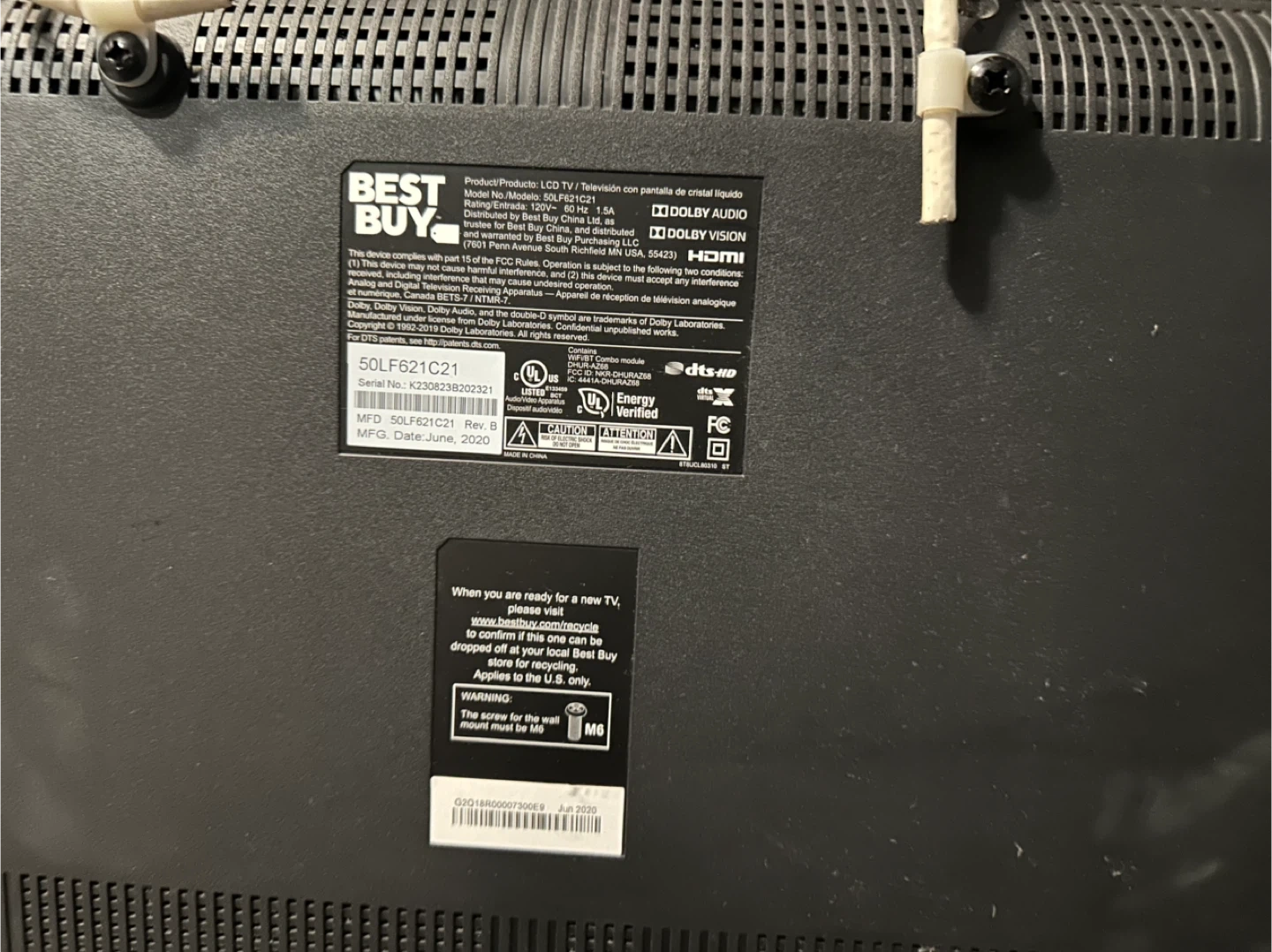 Selling a Toshiba 50" LED TV, model number 50L621C21. It's in great condition and ready for a new home! It was manufactured in June 2020. This TV features Dolby Audio and Dolby Vision for an immersive viewing experience