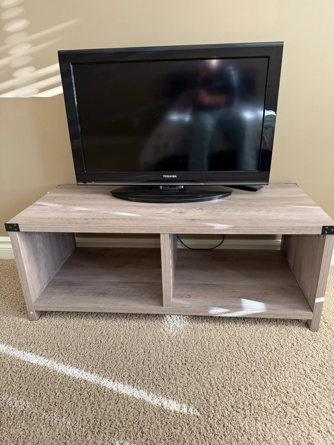 10Selling a 32” Toshiba TV along with a wood TV stand. Perfect for a smaller space or a secondary viewing area. The stand has open shelving for media components or storage. Great condition and ready for a new home! Can be sold separately