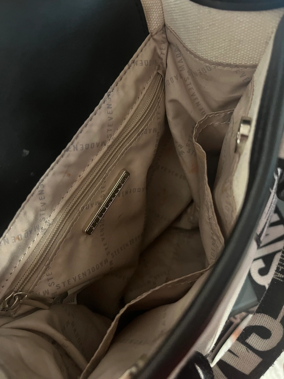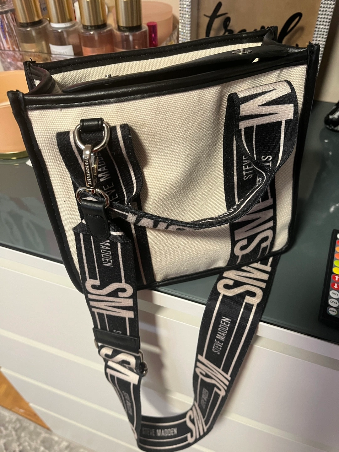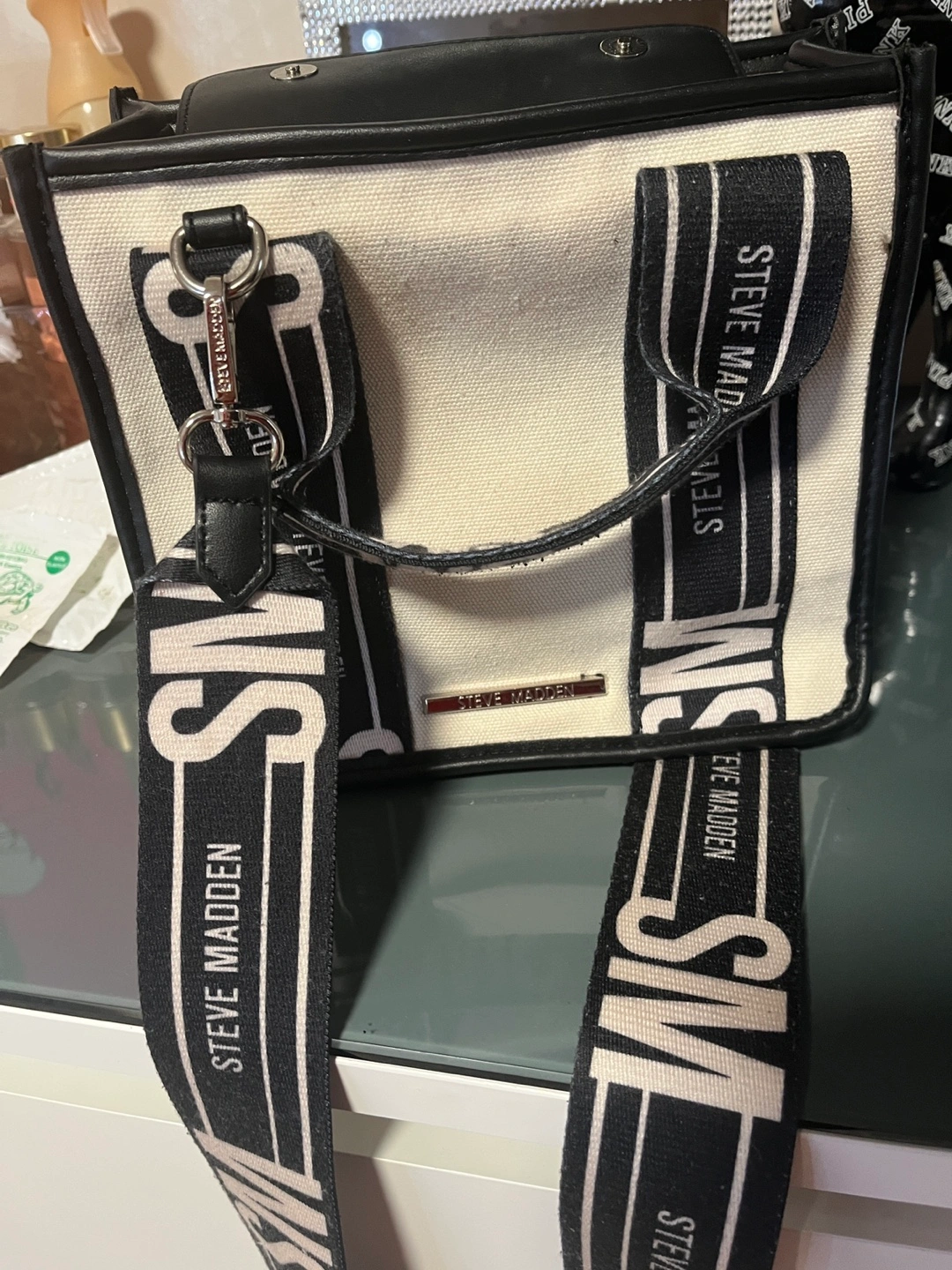Selling a Steve Madden tote bag. It features a stylish design with black and white straps. Perfect for everyday use!