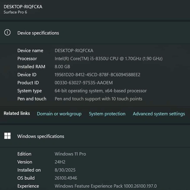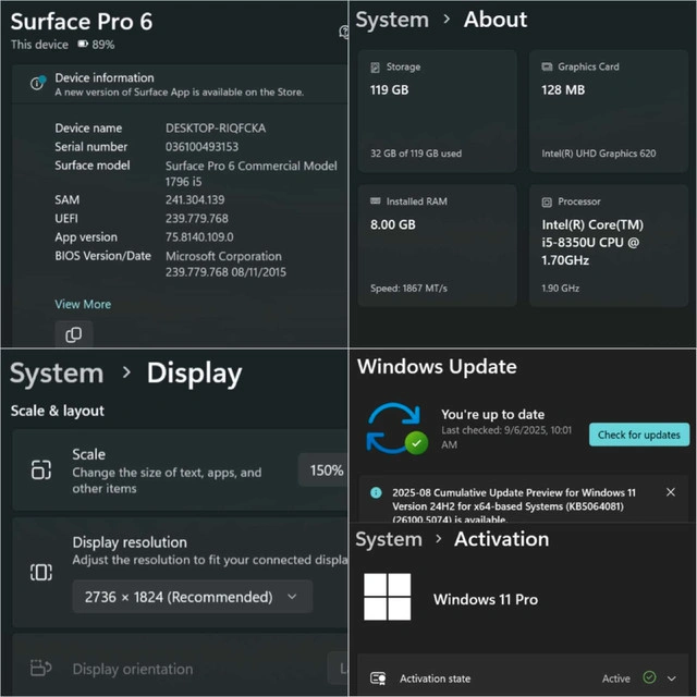Selling a used Microsoft Surface Pro 6 that's ready to go! This versatile 2-in-1 device features an Intel Core i5-8350U processor, 8GB of RAM, and runs Windows 11 Pro, making it perfect for both work and play. Looking at similar listings, I'd suggest $350 as a fair price. If you're seeing this ad, yes, it's still available!