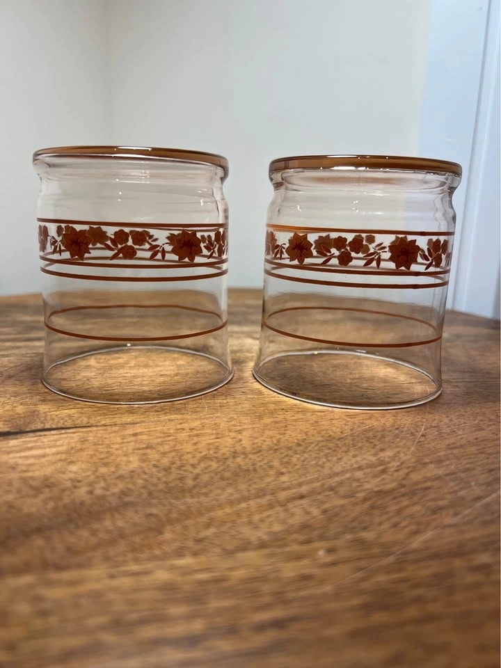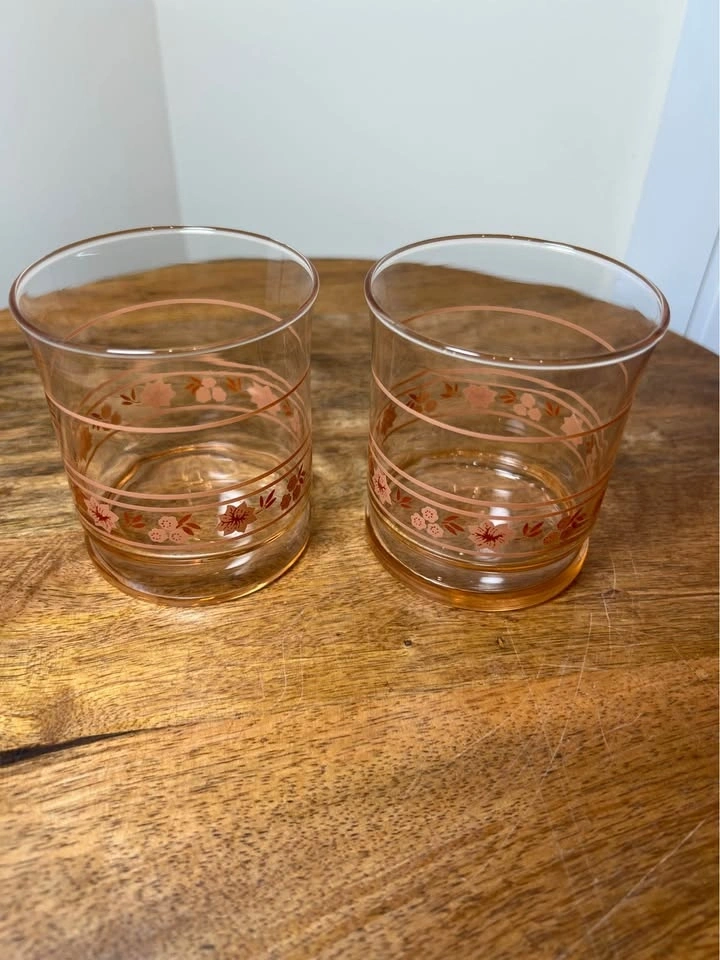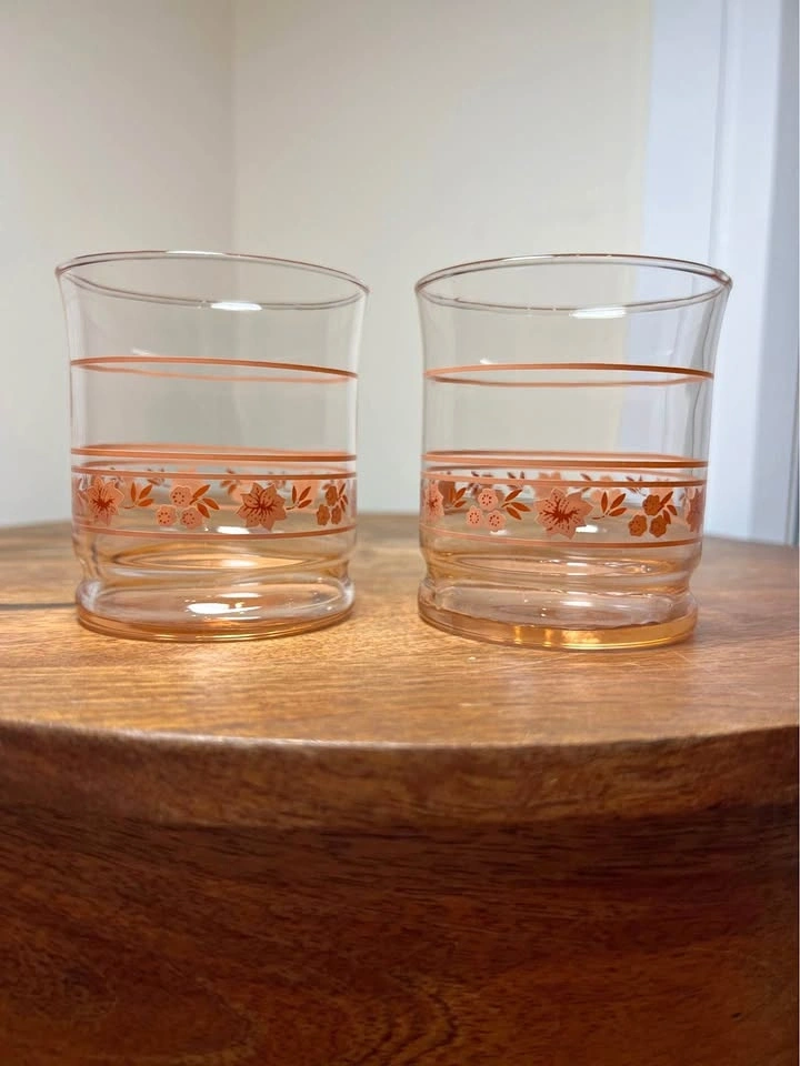 These are vintage Libbey "Peach Blossom" (sometimes called "Pink Blossom") glasses. This mid-century modern glassware features a clear body with a light pink or peach-tinted weighted bottom and is decorated with a peach-pink floral and stripe motif. The specific glasses shown are most commonly identified as juice glasses (roughly 3.5 inches tall) or rocks glasses. Preowned. Pickup is 58th and 7th Ave in midtown Manhattan.