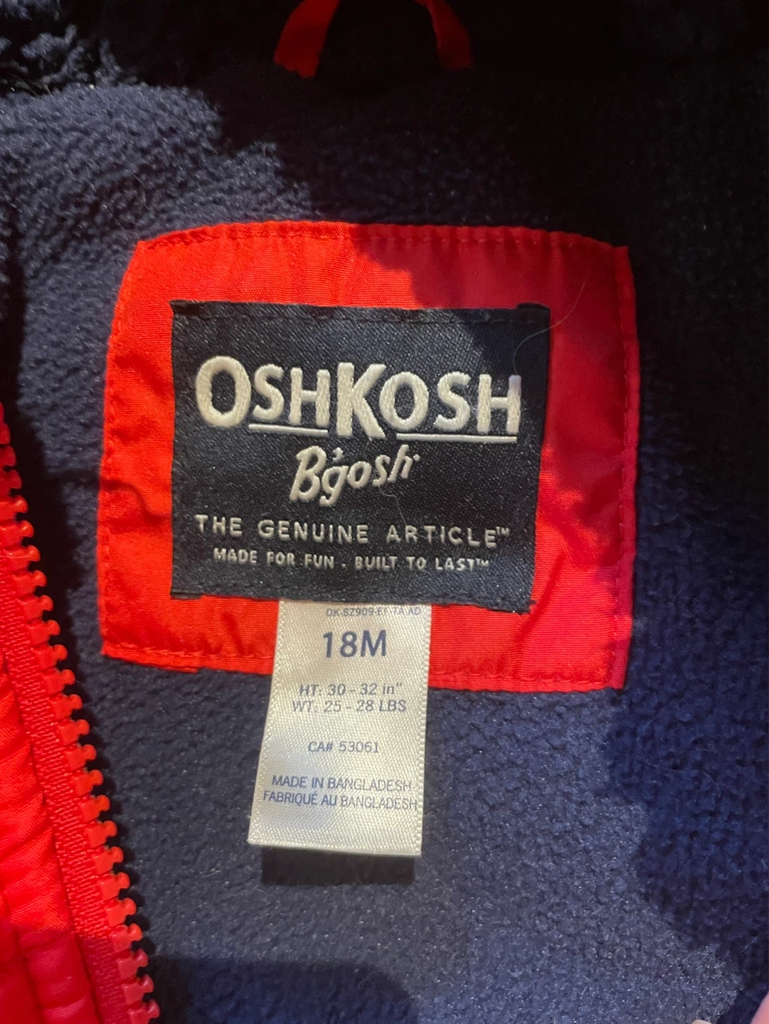 Red puffer jacket from OshKosh B'gosh. Size is 18 months. It's made for fun and built to last!