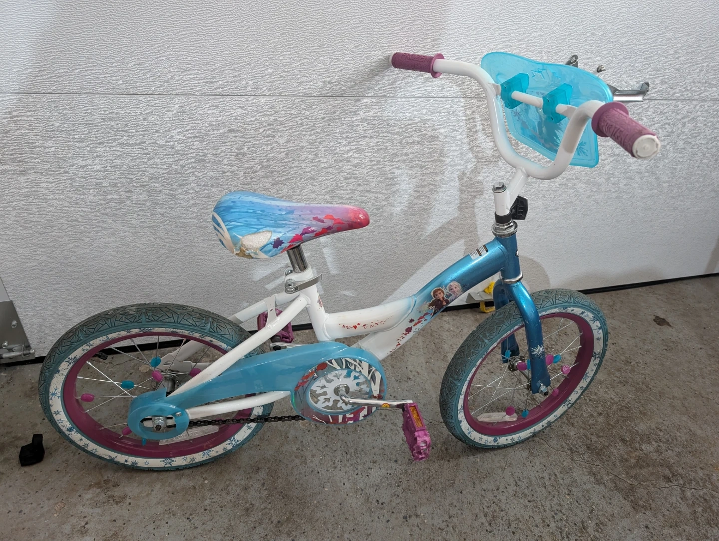 This is a kids' bicycle featuring characters from Disney's Frozen. It's blue and white with purple accents. The seat has a colourful Frozen design. It's a fun bike for young riders!