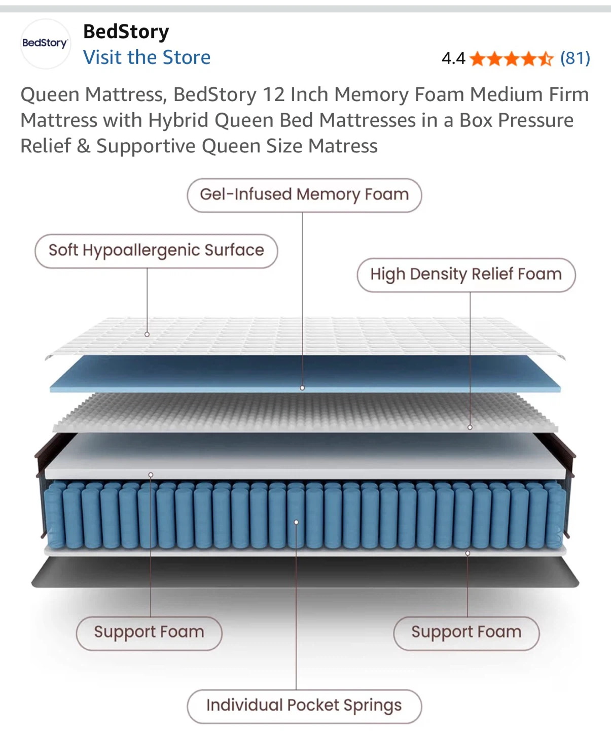This BedStory mattress features gel-infused memory foam and individual pocket springs for support. It's a queen size mattress with a firm feel. Pressure relief and a hypoallergenic surface are included.