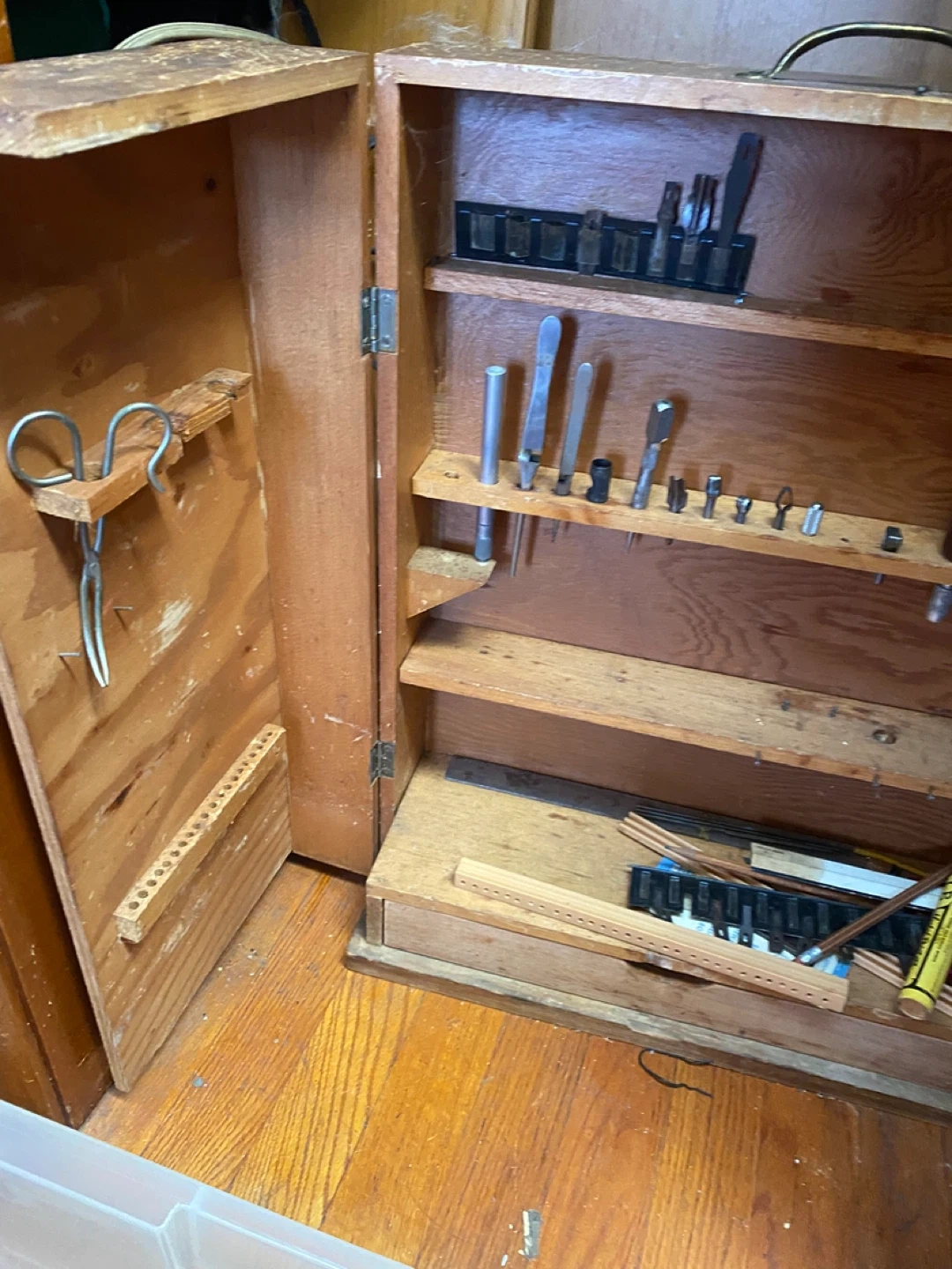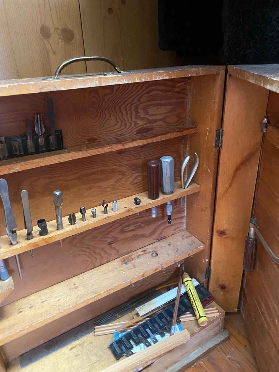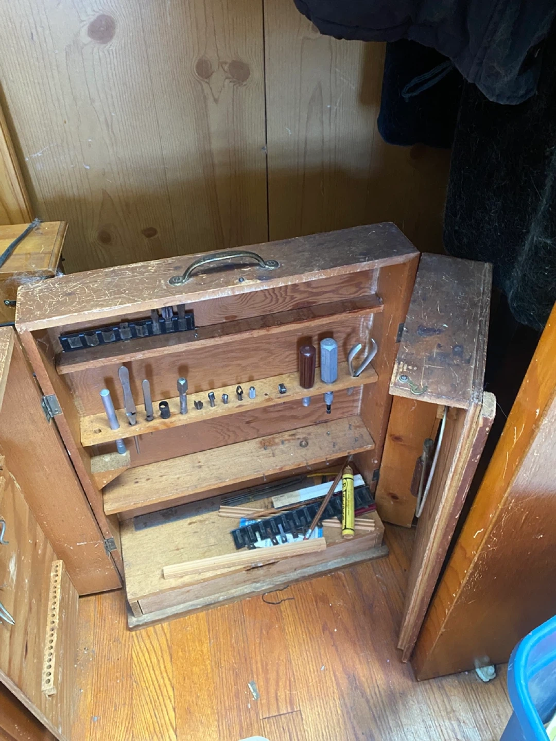 This vintage wooden tool box is packed with various small tools and accessories. It features multiple shelves and compartments for organization. Great for a hobbyist or collector!