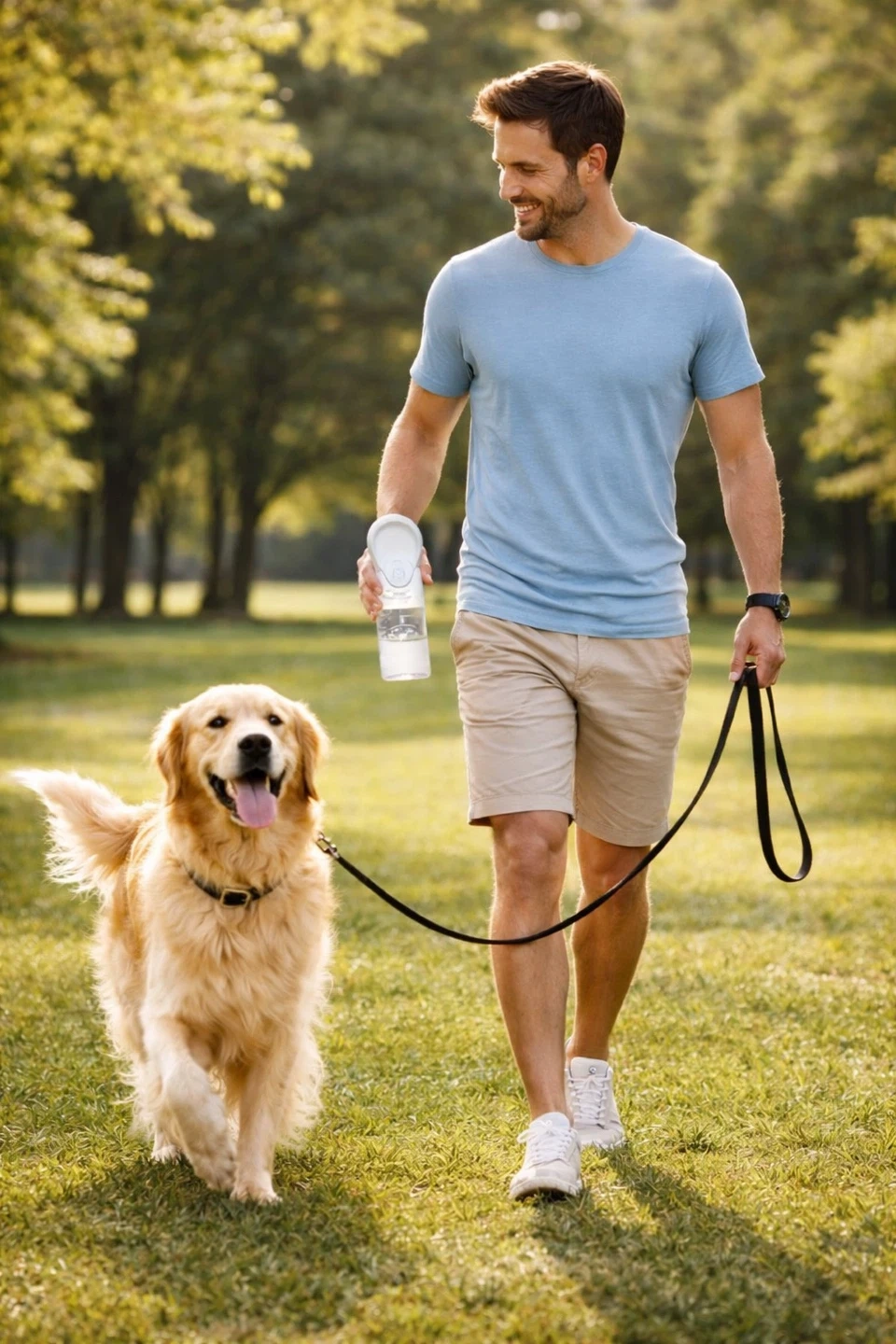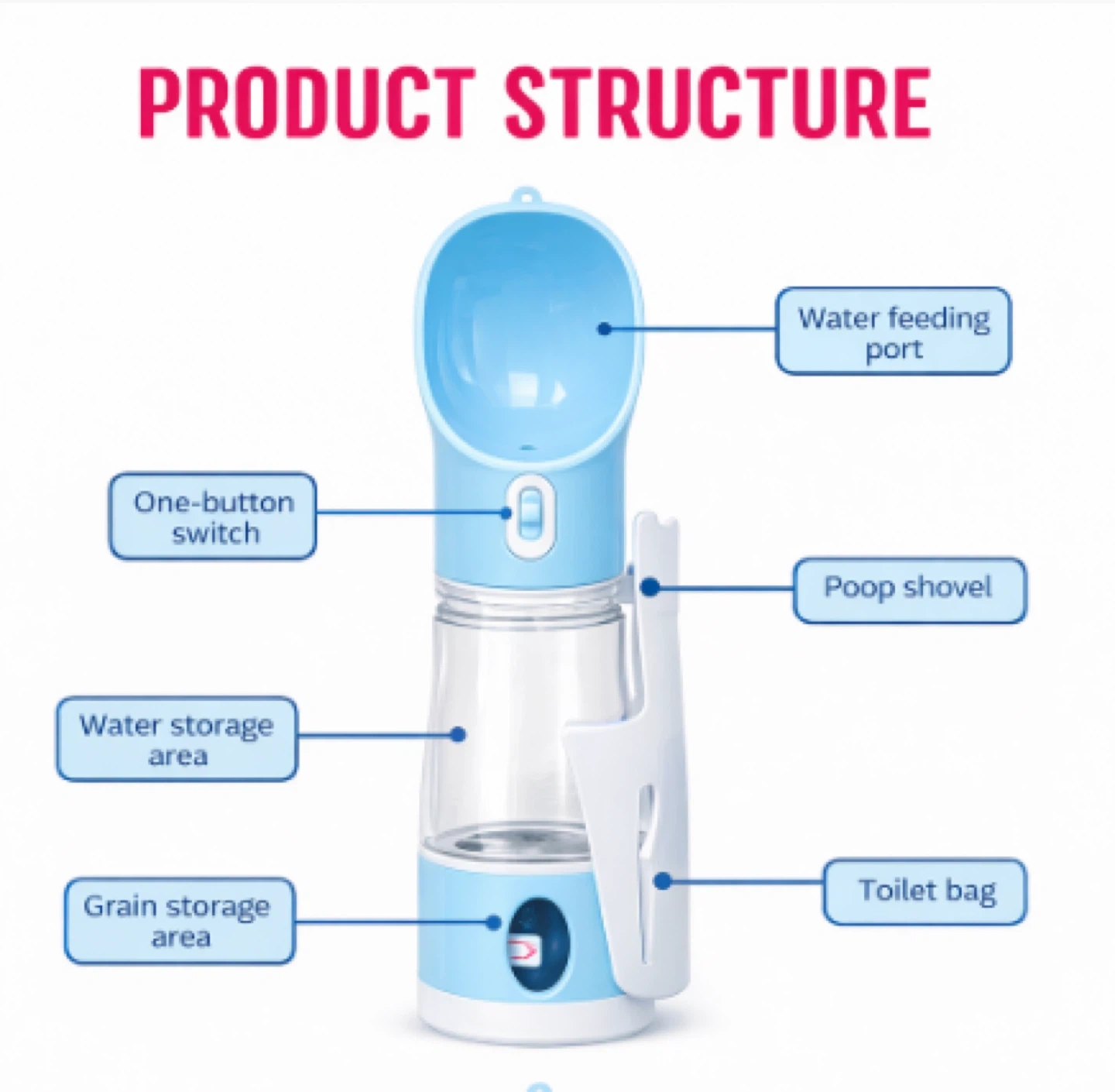 This PETMALIA portable water bottle is designed for pets on the go. It features a water storage area and a separate compartment for grain, plus a built-in poop shovel. The one-button switch makes dispensing water easy. It's 11 inches tall and 2.9 inches wide.
