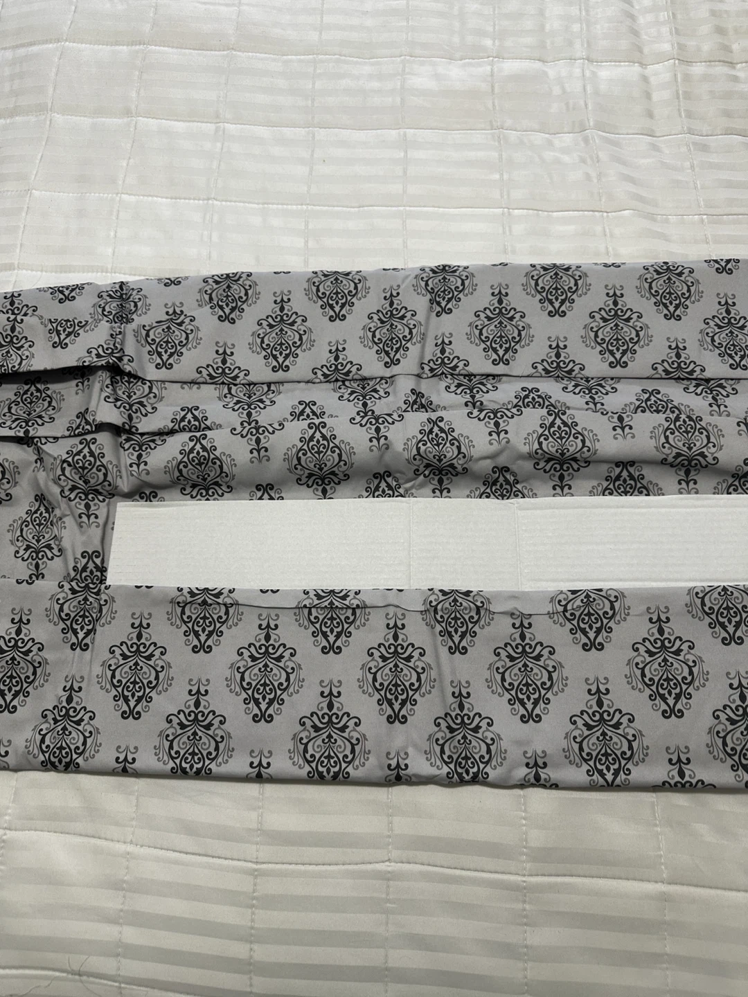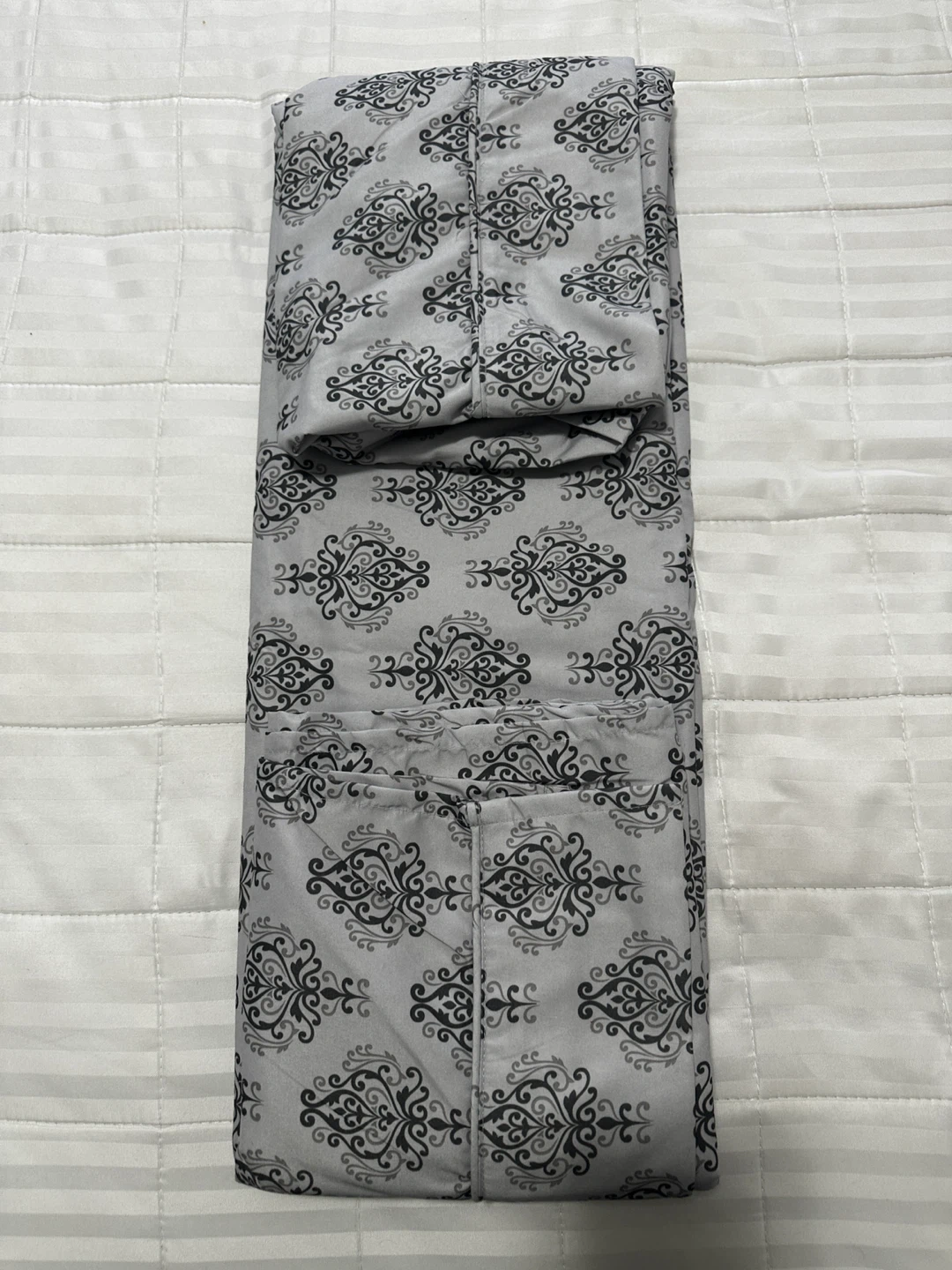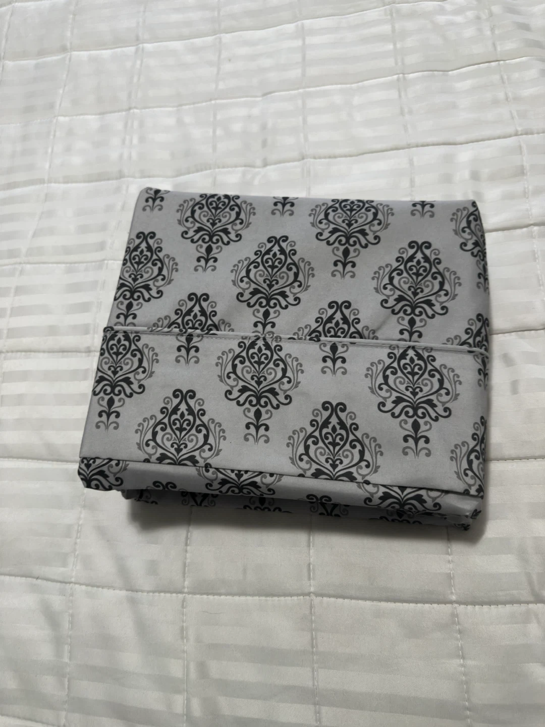Selling a bed sheet with a grey and black damask-like pattern. It's in great condition and would add a touch of elegance to any bedroom, microfibre bed sheet only , very comfortable