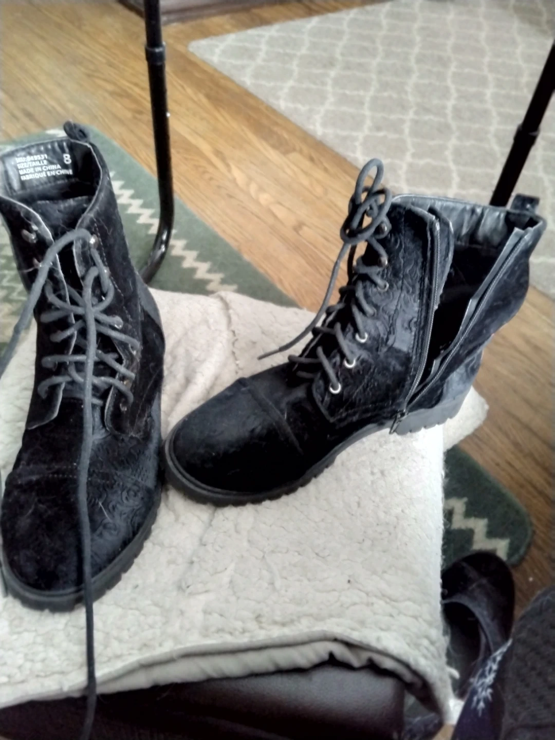 These black velvet combat boots feature a textured damask-style pattern. They have a side zipper and lace-up front for a secure fit. Size is 8.