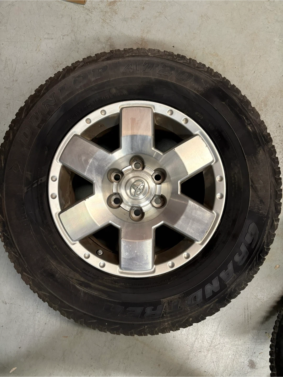 Selling a Toyota rim with a Dunlop Grandtrek AT20 tire. The tire size is AP265/70R17 113S M+S. It's in used condition. From FJ cruiser. Spare tire.