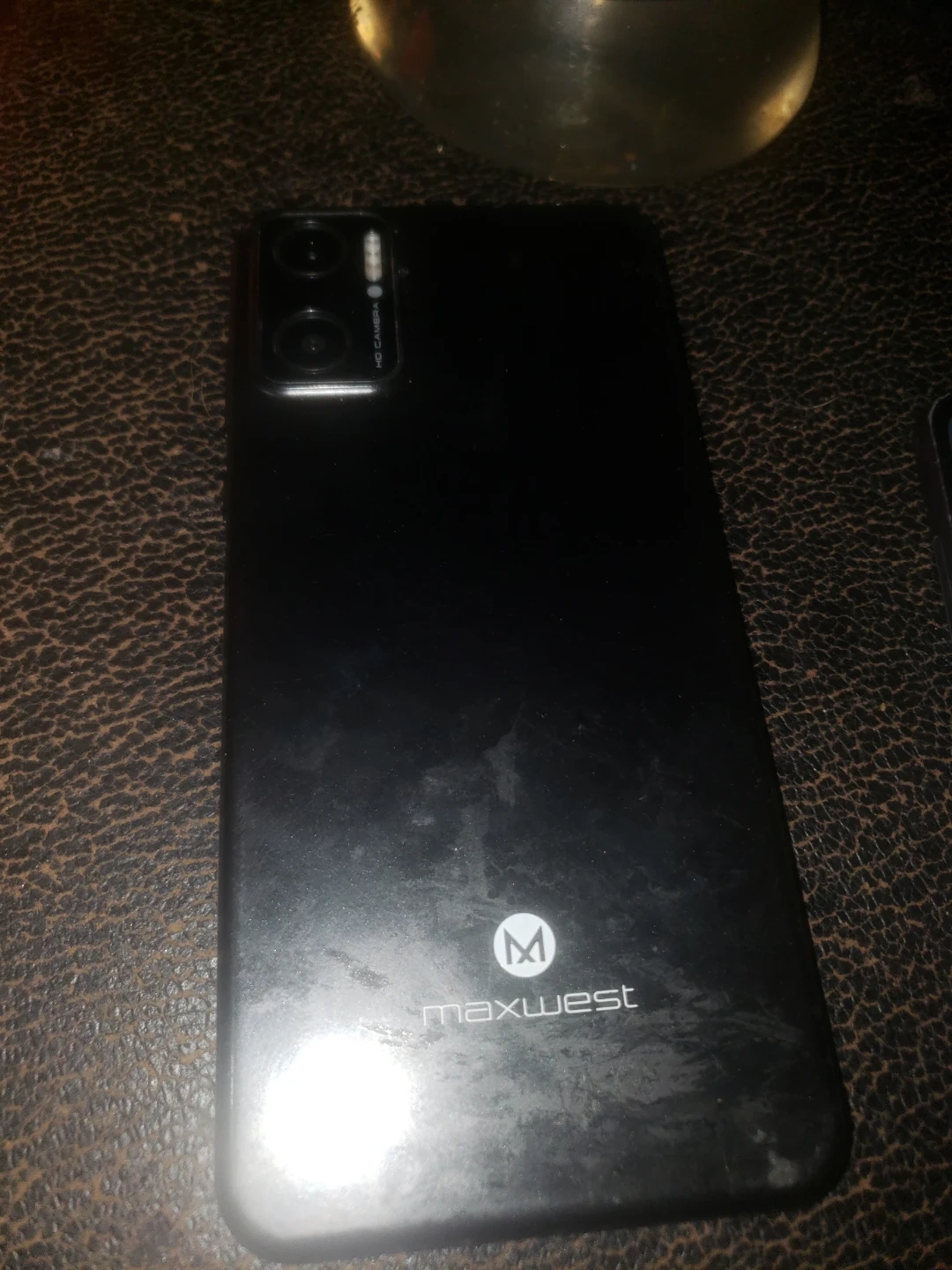 Black Maxwest smartphone with dual rear cameras. This phone's screen is a simple touchscreen interface. It's ready for a new owner!