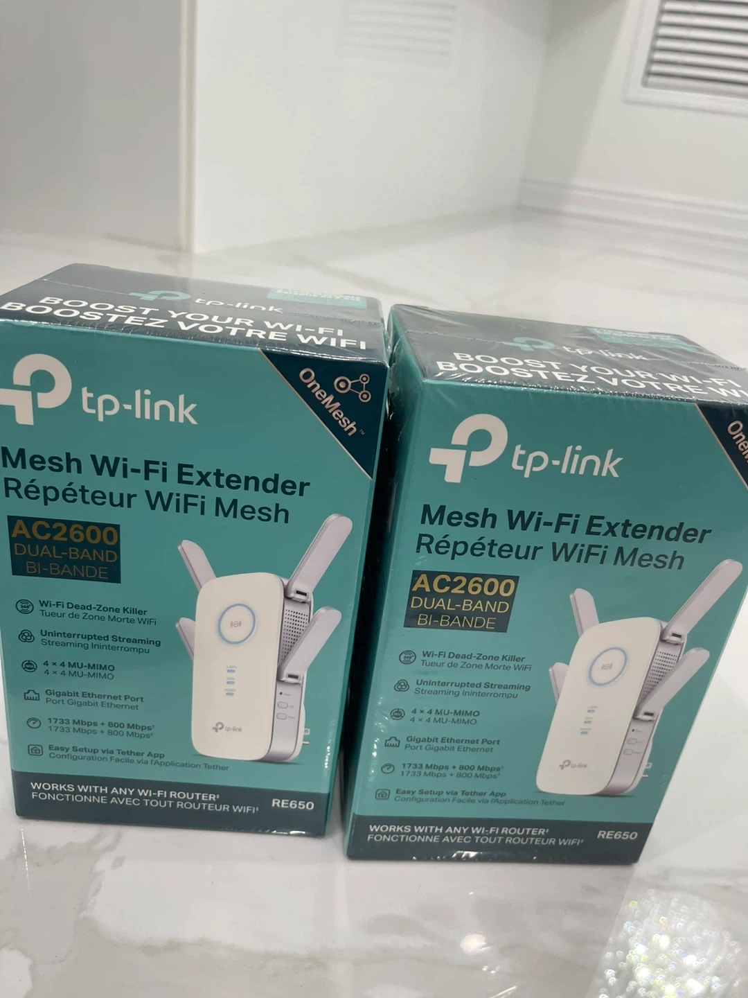 25Selling a brand new TP-Link AC2600 Mesh Wi-Fi Extender, model RE650! Boost your Wi-Fi with this dual-band extender. It features Wi-Fi Dead-Zone Killer, uninterrupted streaming, and 4x4 MU-MIMO. Easy setup via Tether App and works with any Wi-Fi router