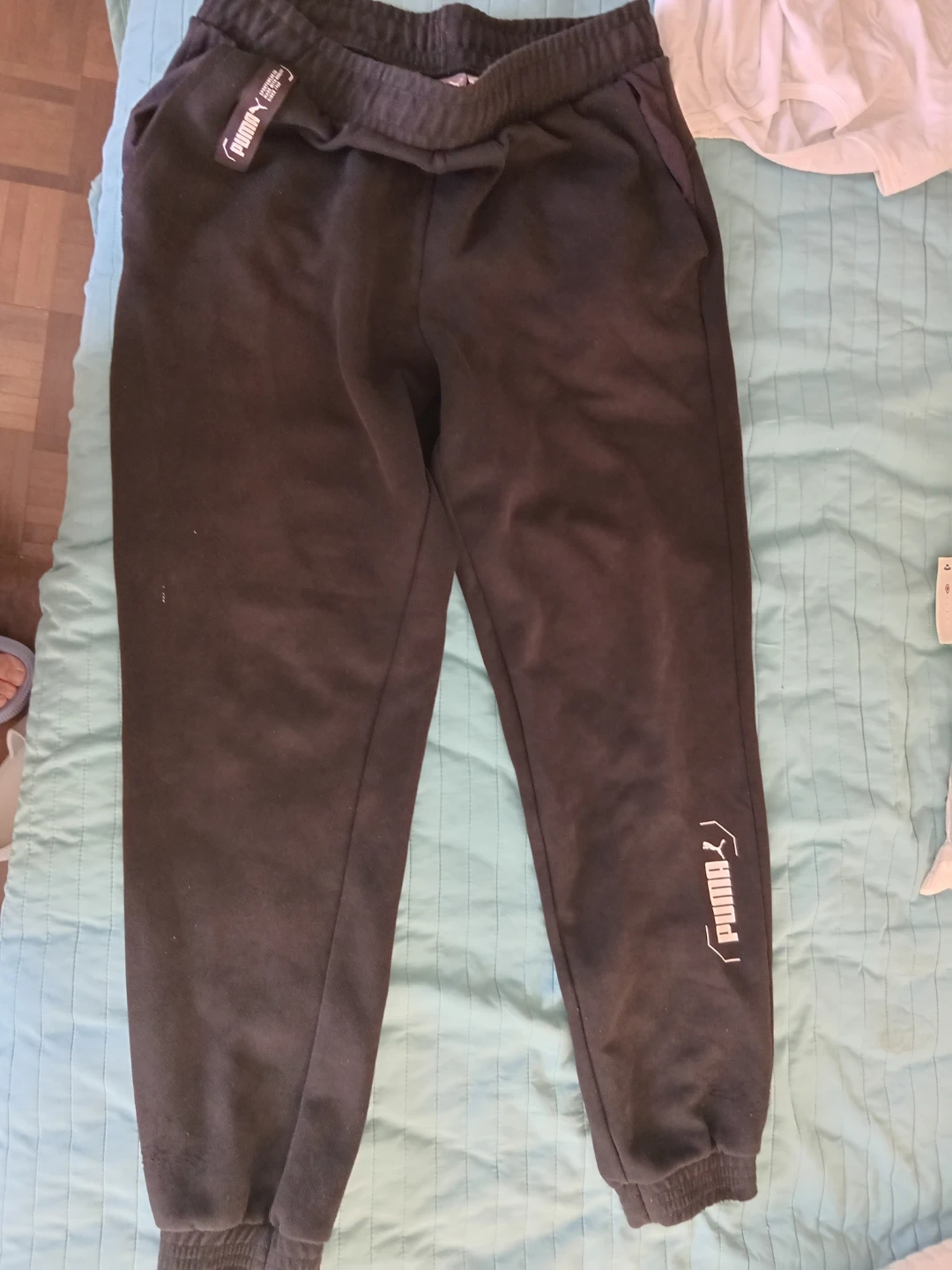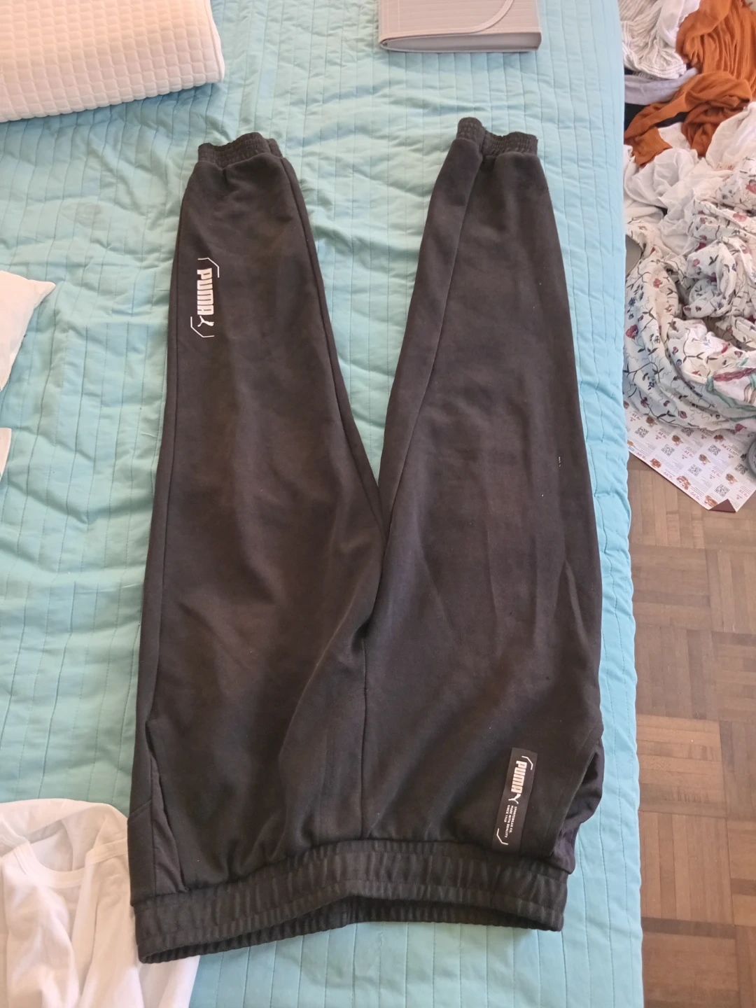 These are black Puma sweatpants. They're made of a comfortable material. They're suitable for casual wear.