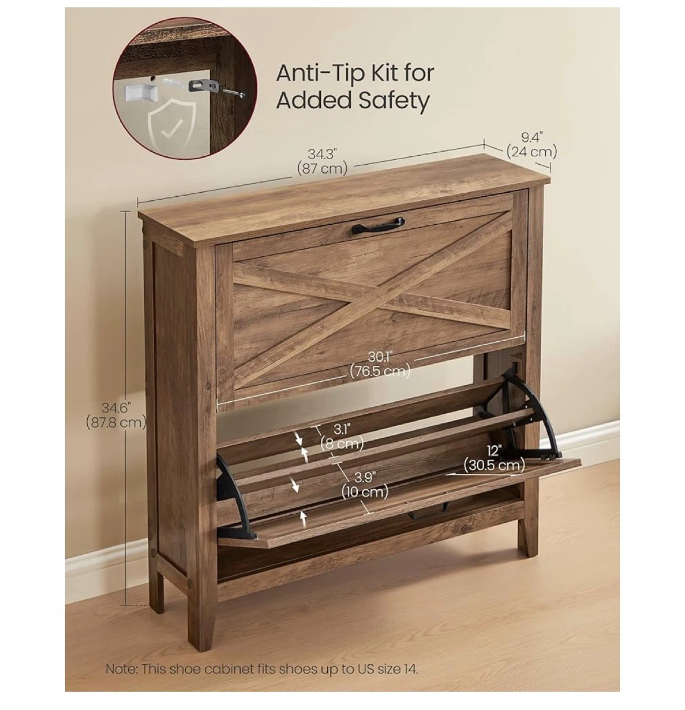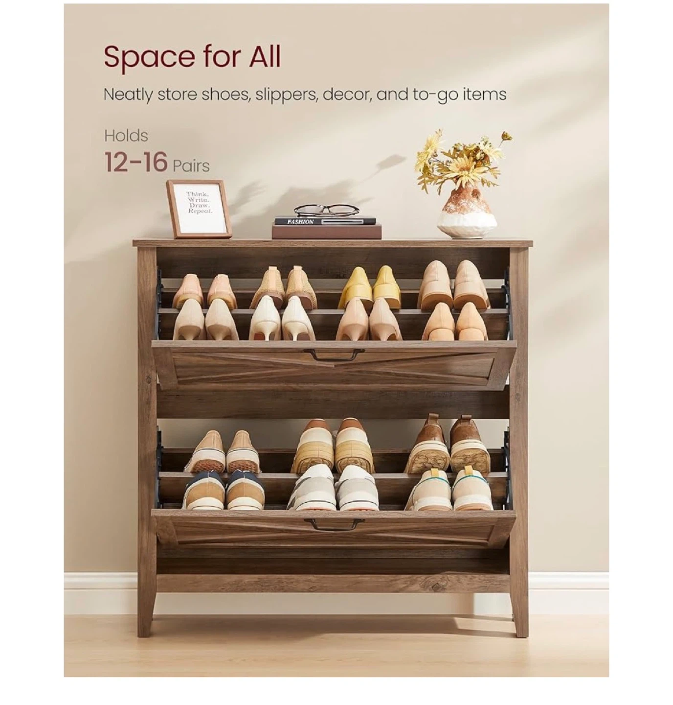 This rustic wood shoe cabinet offers a space-saving solution for your entryway. It features multiple flip-out drawers to neatly store your footwear. The cabinet's slim profile keeps your walkway clear, and it holds 12-16 pairs of shoes. It's great for organizing slippers, sandals, and other shoes up to US size 14!