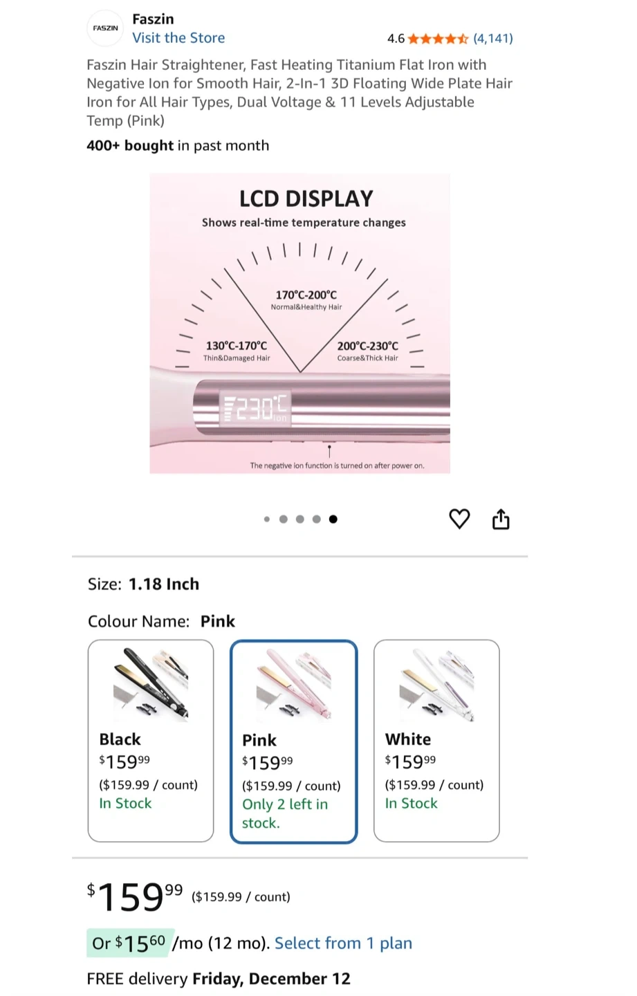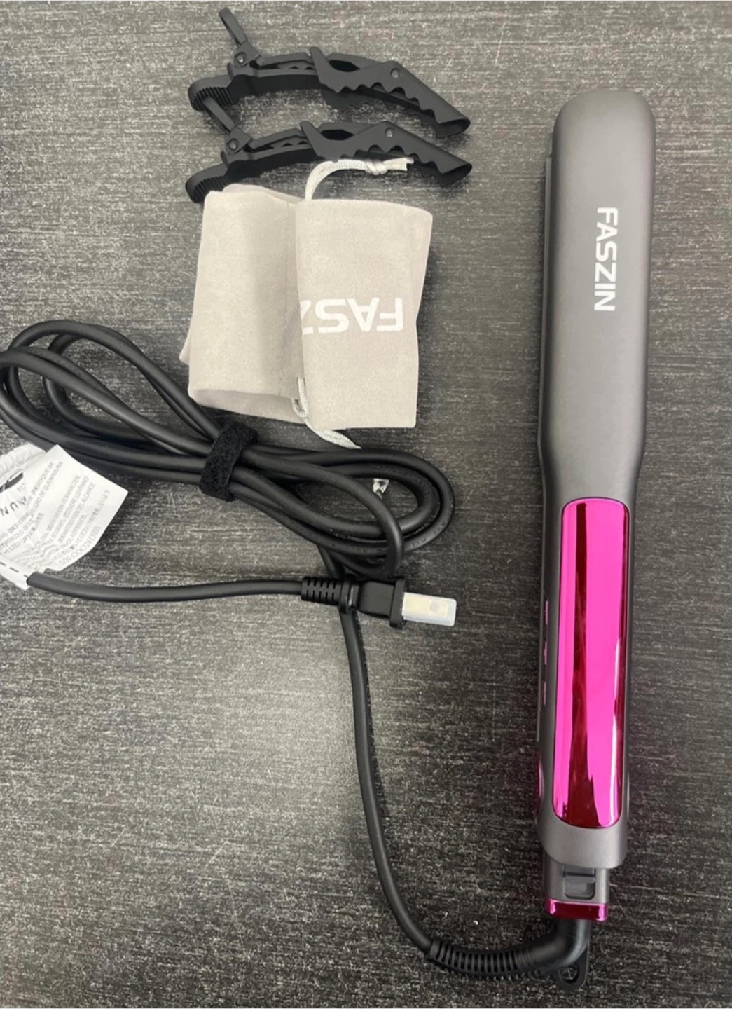 Selling a Faszin hair straightener in pink! It features a fast-heating titanium flat iron with negative ion technology for smooth hair. It's a 2-in-1 3D floating wide plate hair iron suitable for all hair types, with dual voltage and 11 adjustable temperature levels. Comes with clips and a storage bag