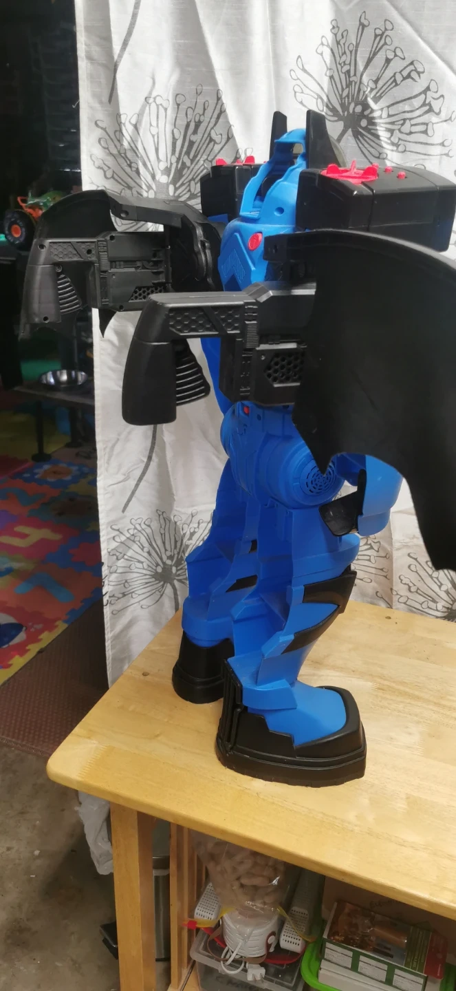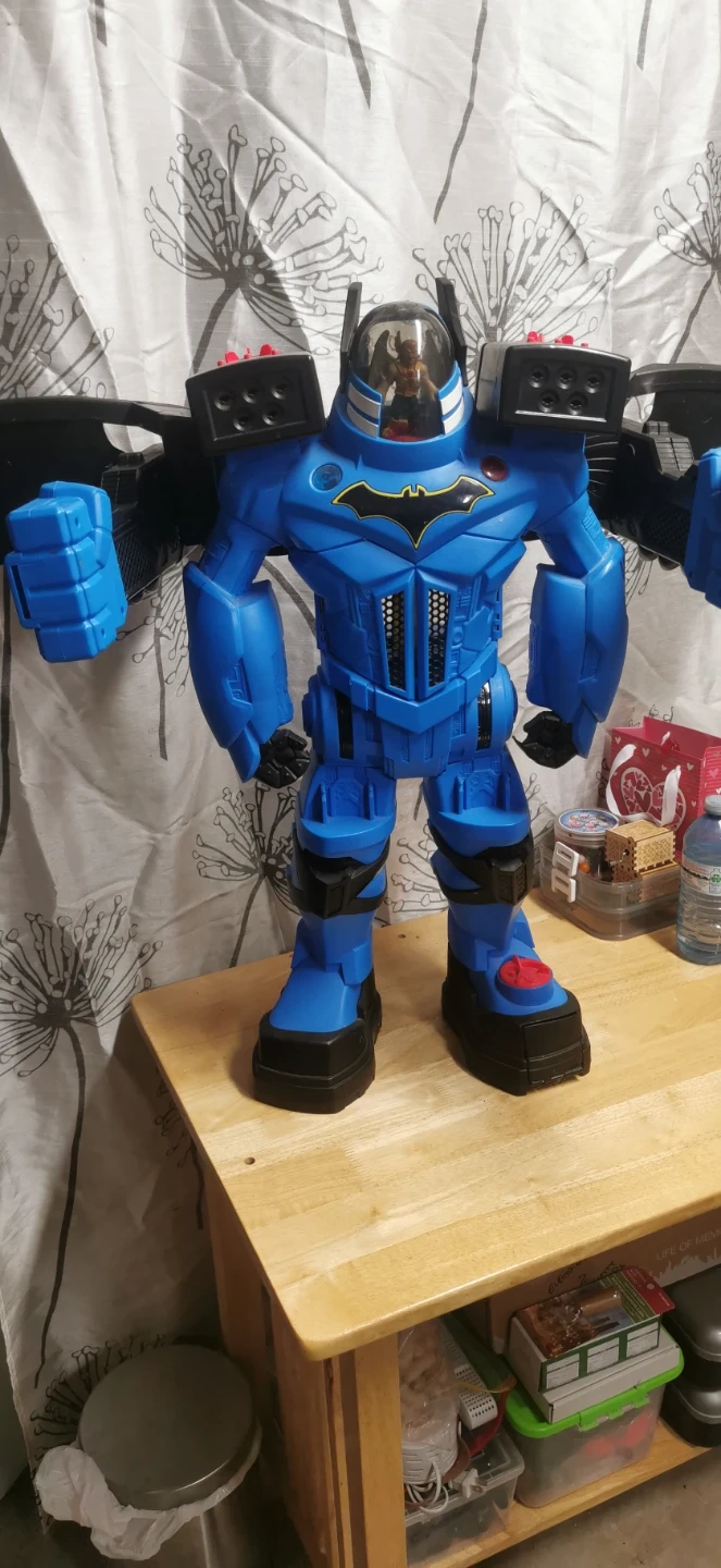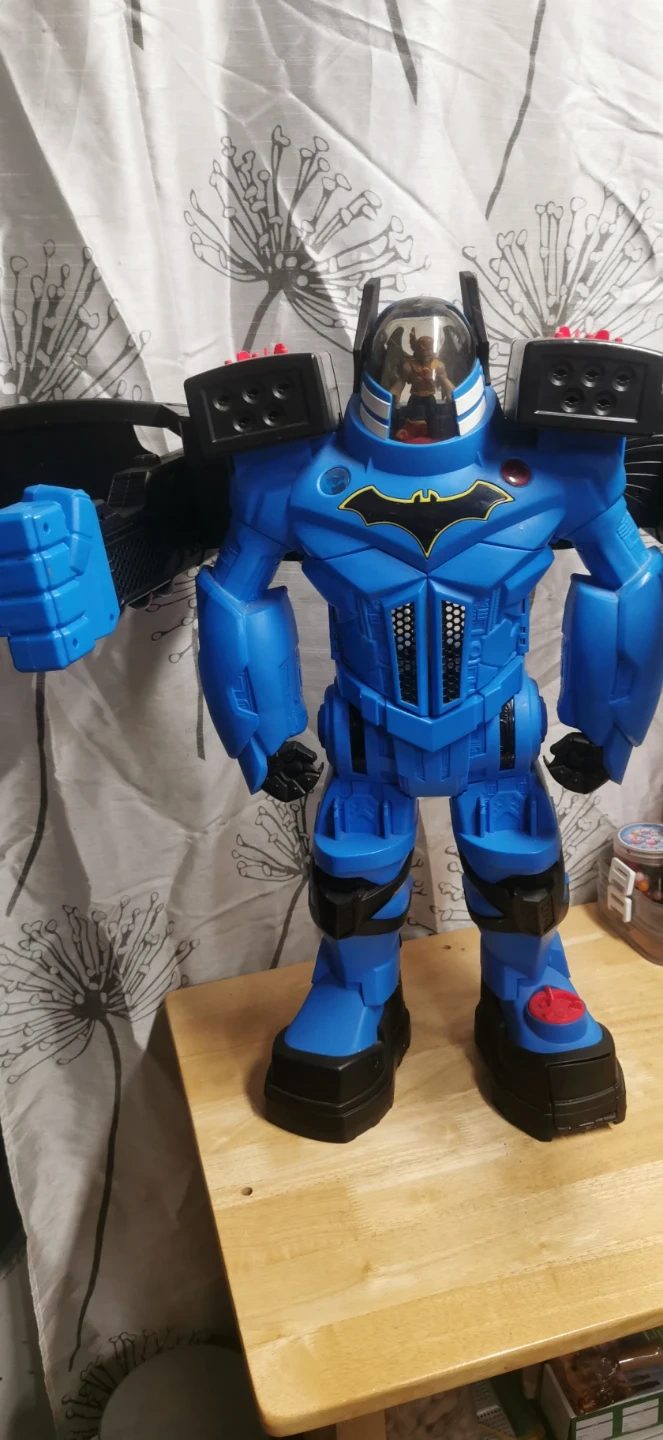This is a large blue Batman mech suit toy, featuring a bat symbol on the chest and detachable shoulder launchers. It also includes a mini Batman figure inside the cockpit and detachable arm pieces. A great collectible for Batman fans!