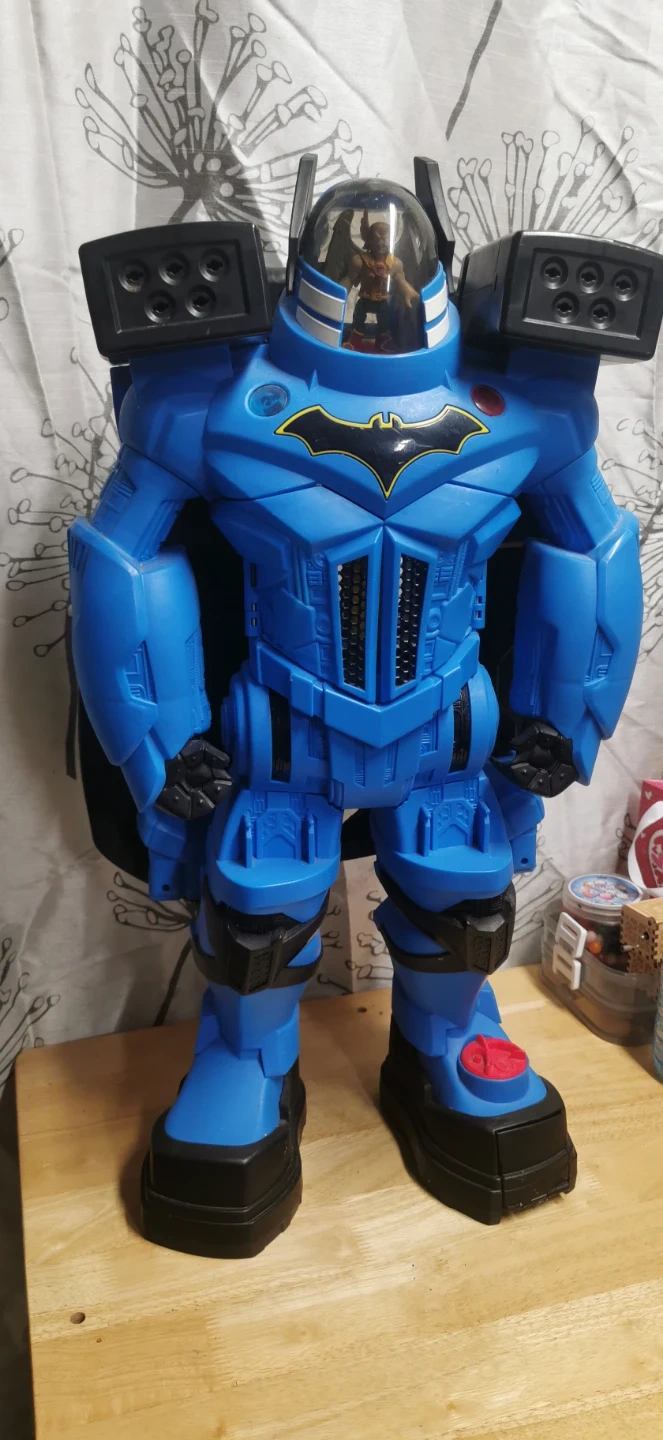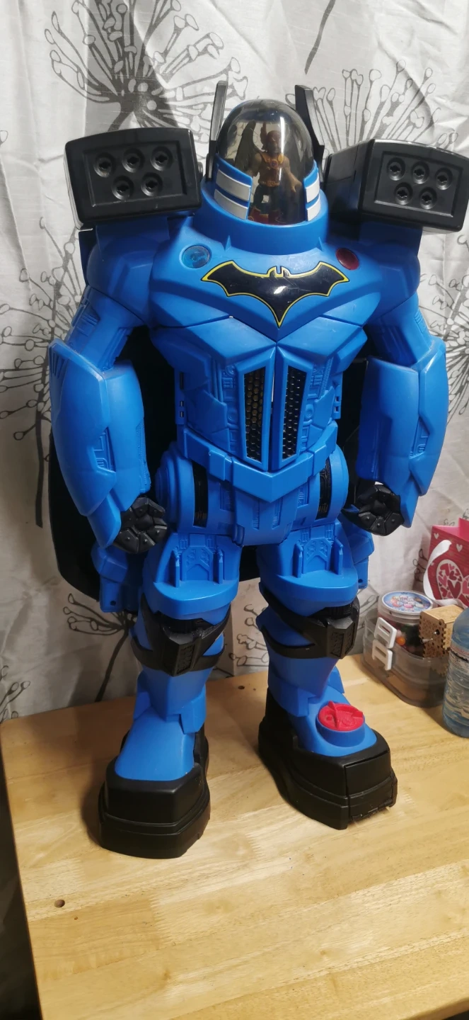 This is a large blue Batman mech suit toy, featuring a bat symbol on the chest and detachable shoulder launchers. It also includes a mini Batman figure inside the cockpit and detachable arm pieces. A great collectible for Batman fans!