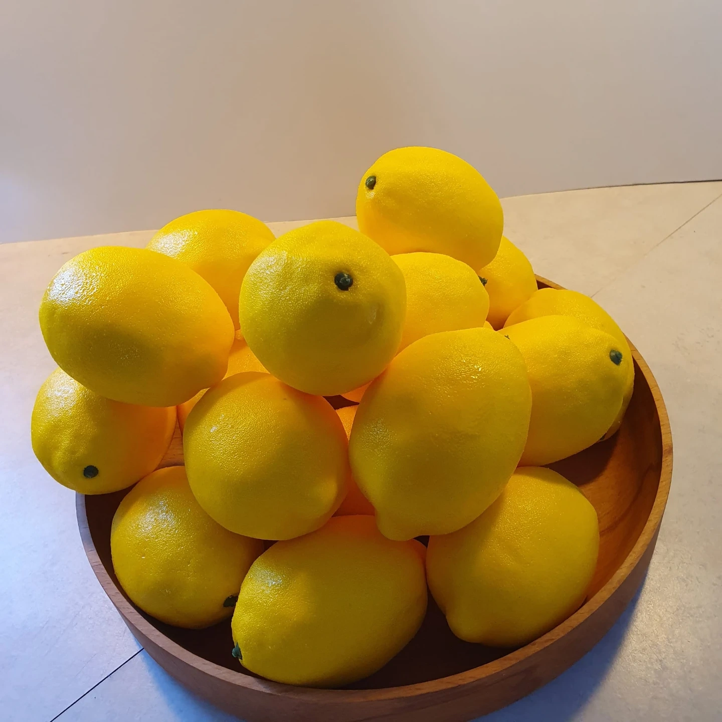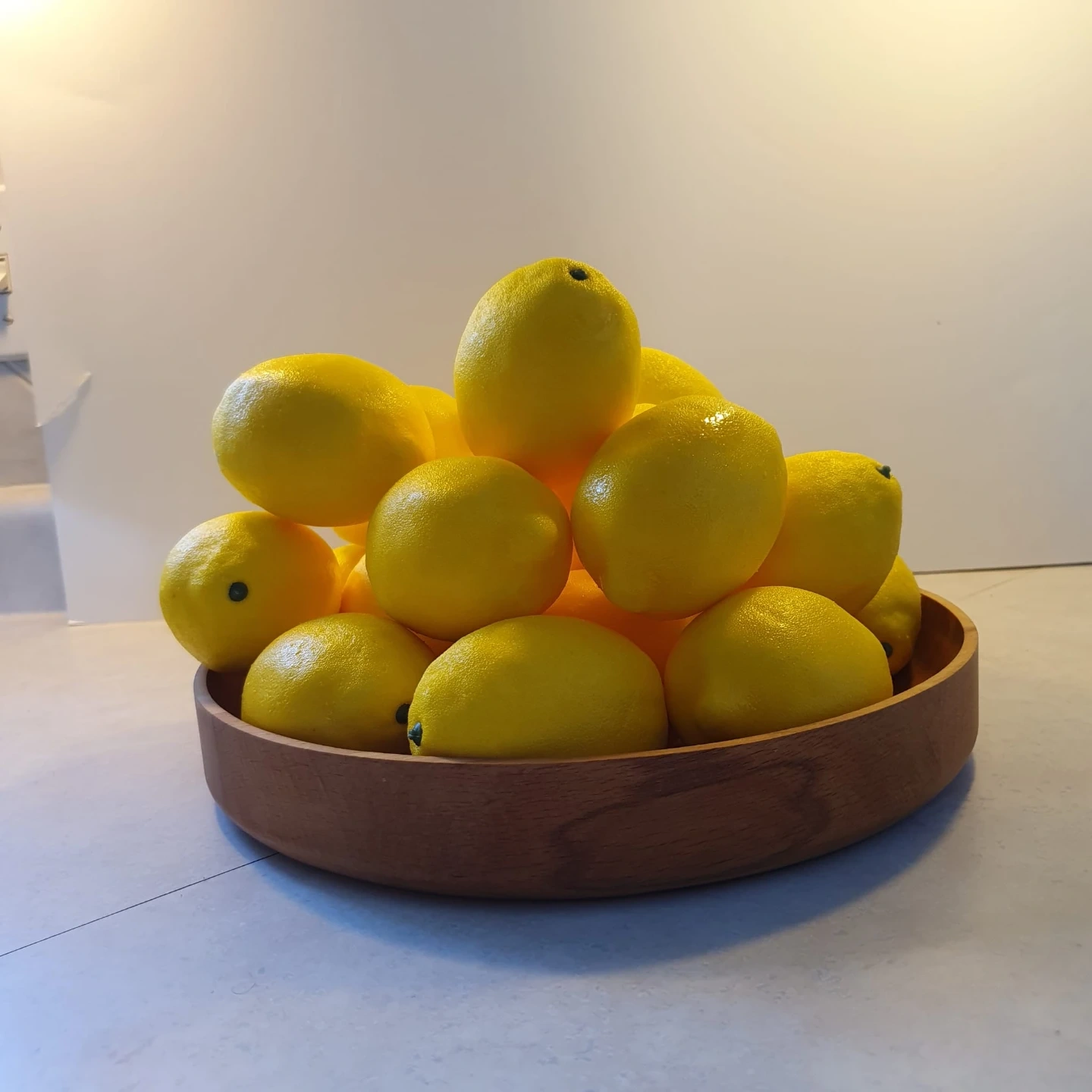 A bowl of decorative lemons. These are for display purposes and add a pop of colour to any space. They look like real lemons but aren't edible.