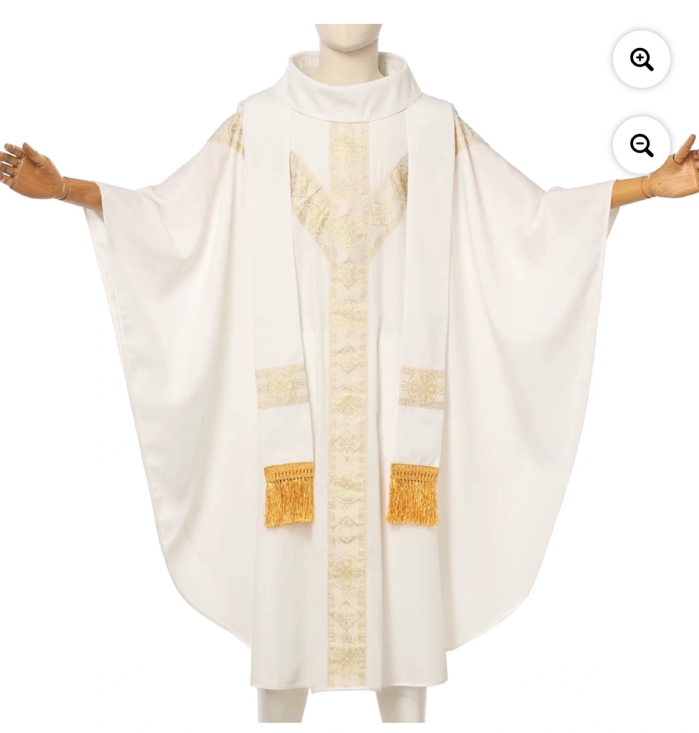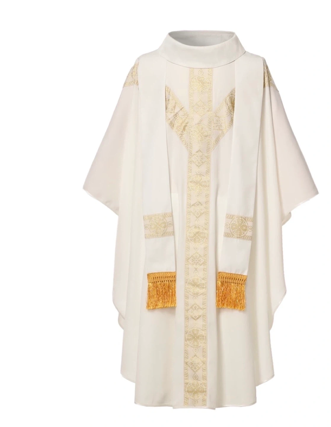This is a white Catholic priest chasuble with gold embroidered details and fringe. It's designed for church services and vestments. Made with quality fabric for comfort and durability.