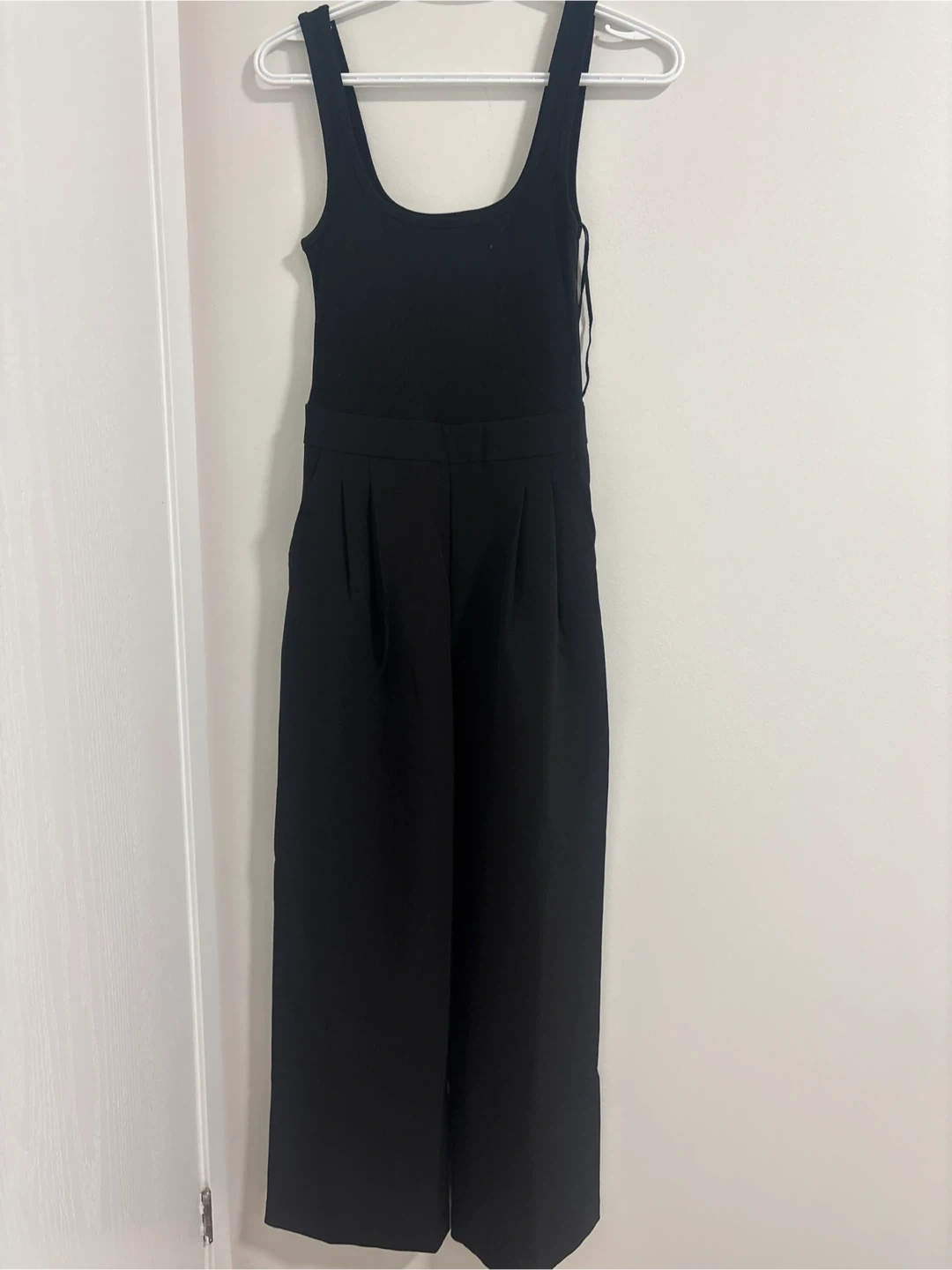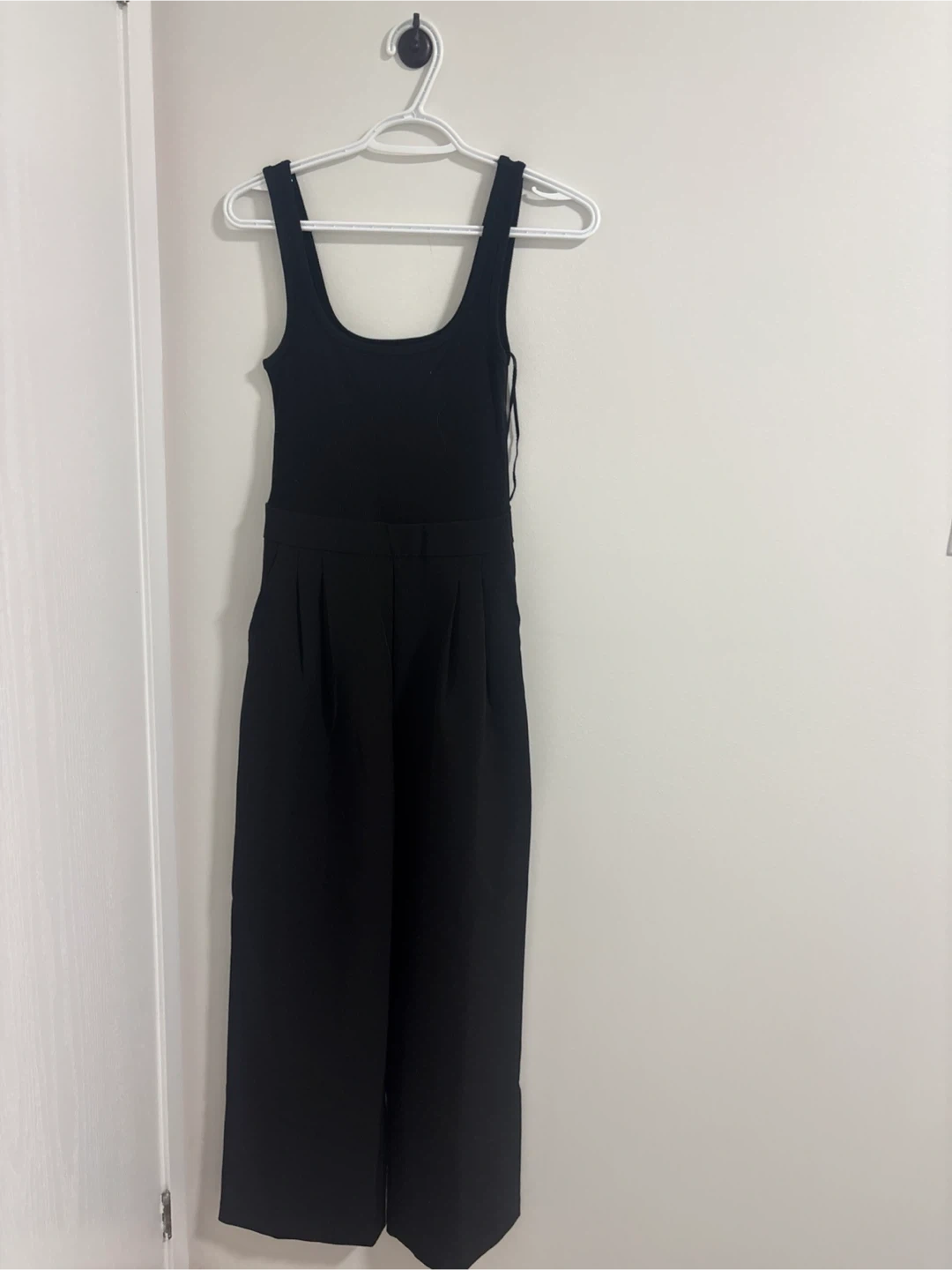 A black sleeveless jumpsuit with a scoop neckline and wide-leg pants. It features a defined waistband and side pockets. This versatile piece can be dressed up or down for various occasions. Size xS pick up cash only