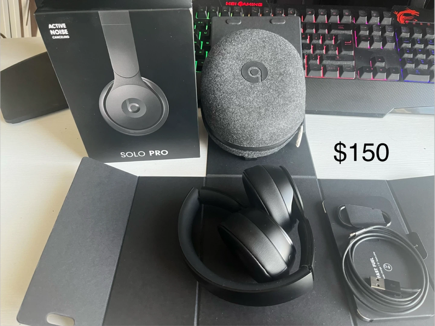 Selling a pair of Beats Solo Pro wireless headphones. They come with the box and all original components, including the carrying case and charging cable. Great sound quality and active noise cancelling! Only used 2 times.
