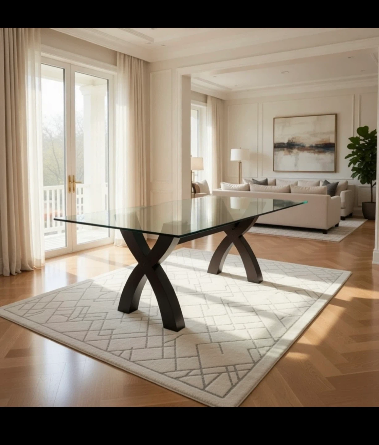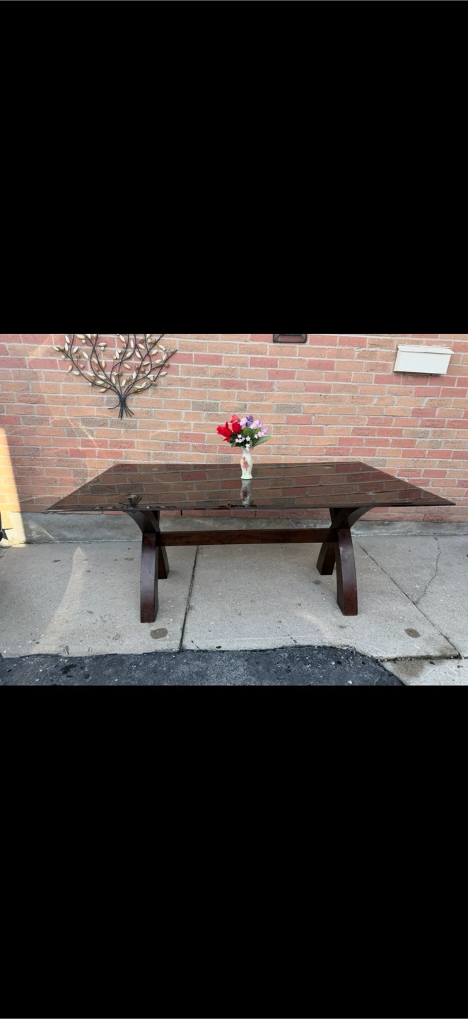 Beautiful Glass Table with a Dark Wood Base Crossed Legs