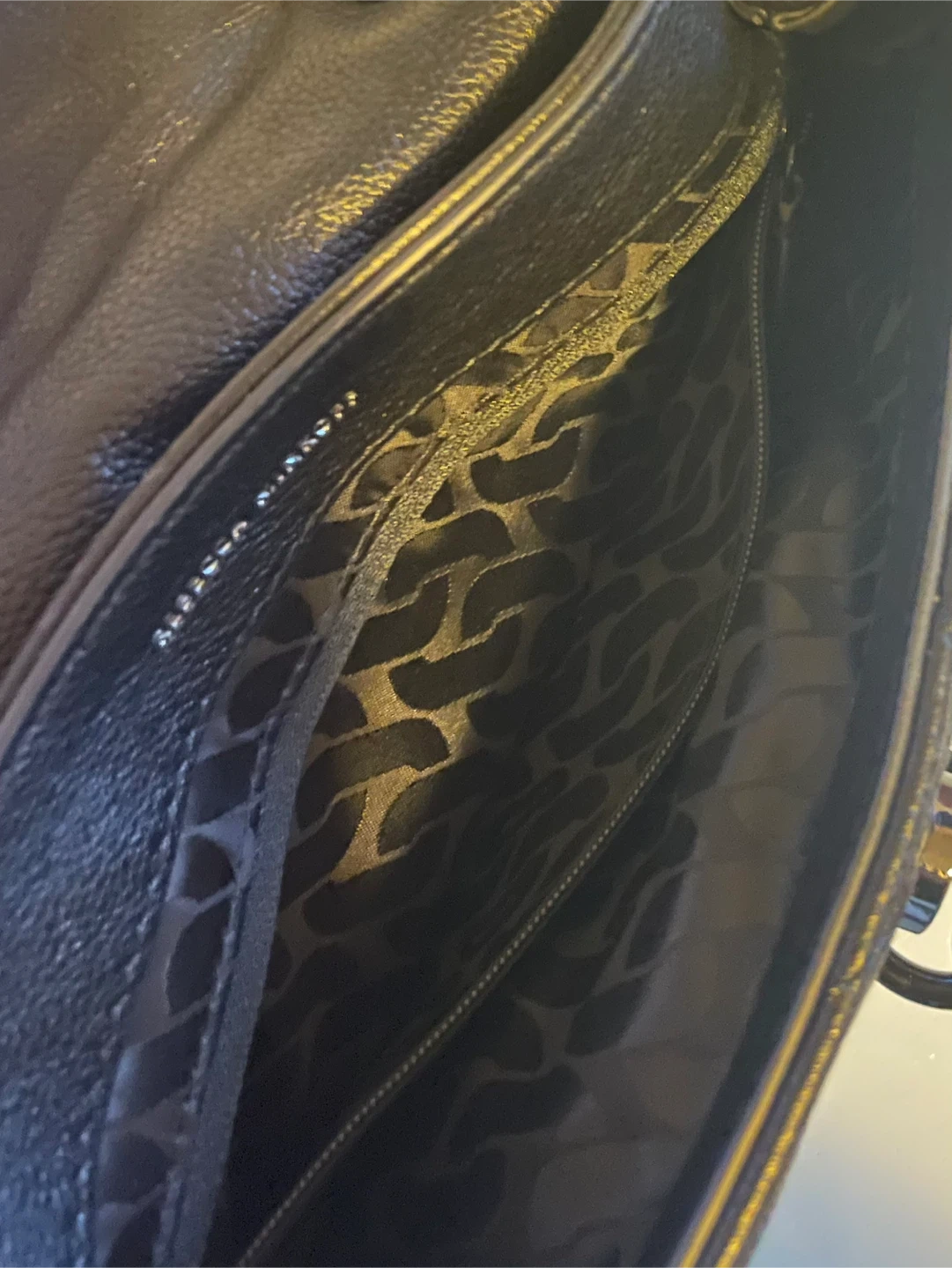 • Black lining, one exterior back slip pocket with magnetic clasp, one interior zip pocket