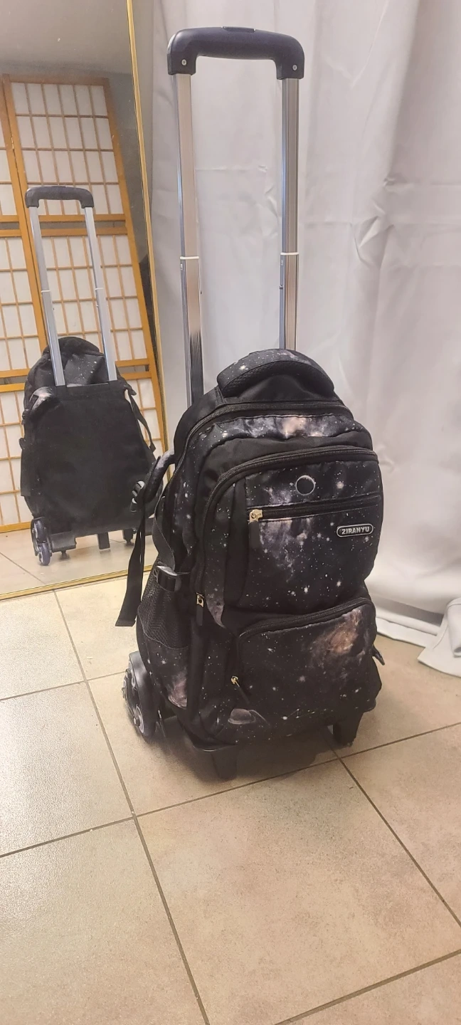 Like-new galaxy print rolling backpack with detachable folding trolley, and retractable handle for easy storage. Multiple compartments and pockets help keep belongings organized.