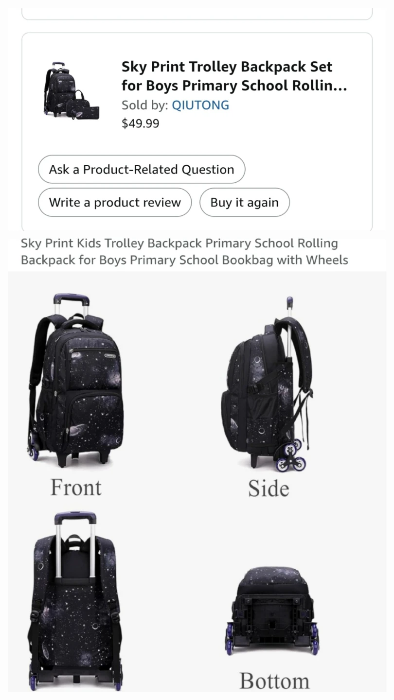 Like-new galaxy print rolling backpack with detachable folding trolley, and retractable handle for easy storage. Multiple compartments and pockets help keep belongings organized.
