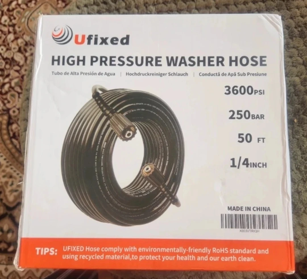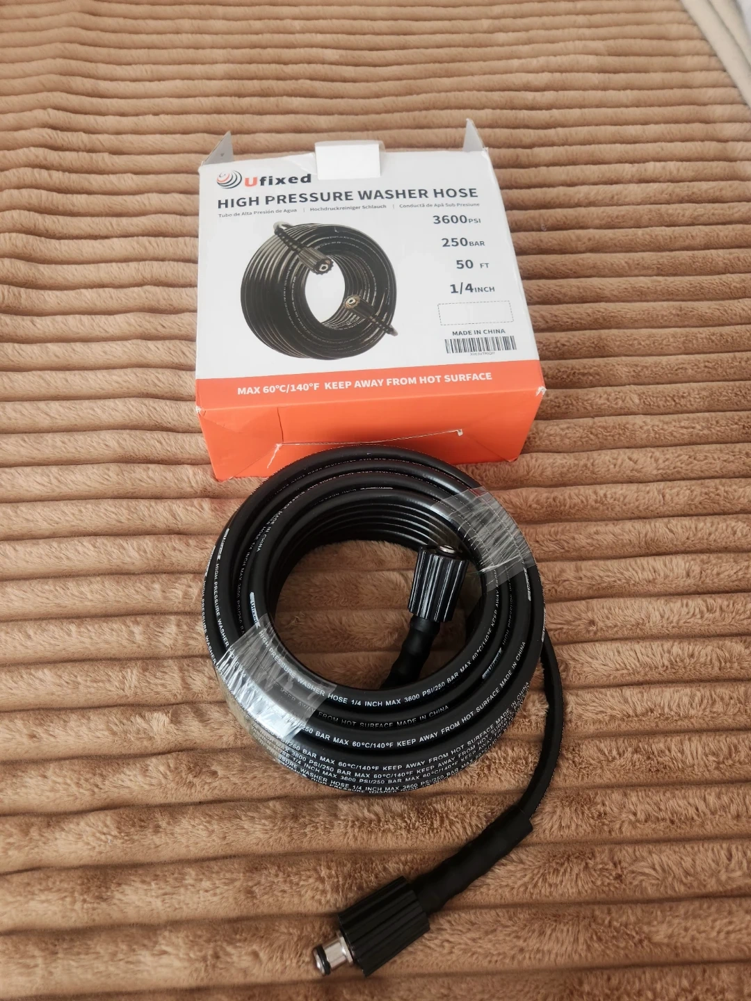 This Ufixed high pressure washer hose is 50 ft long. It can handle up to 3600 PSI and 250 BAR. The hose is 1/4 inch in diameter. Keep away from hot surfaces, max 60°C/140°F.