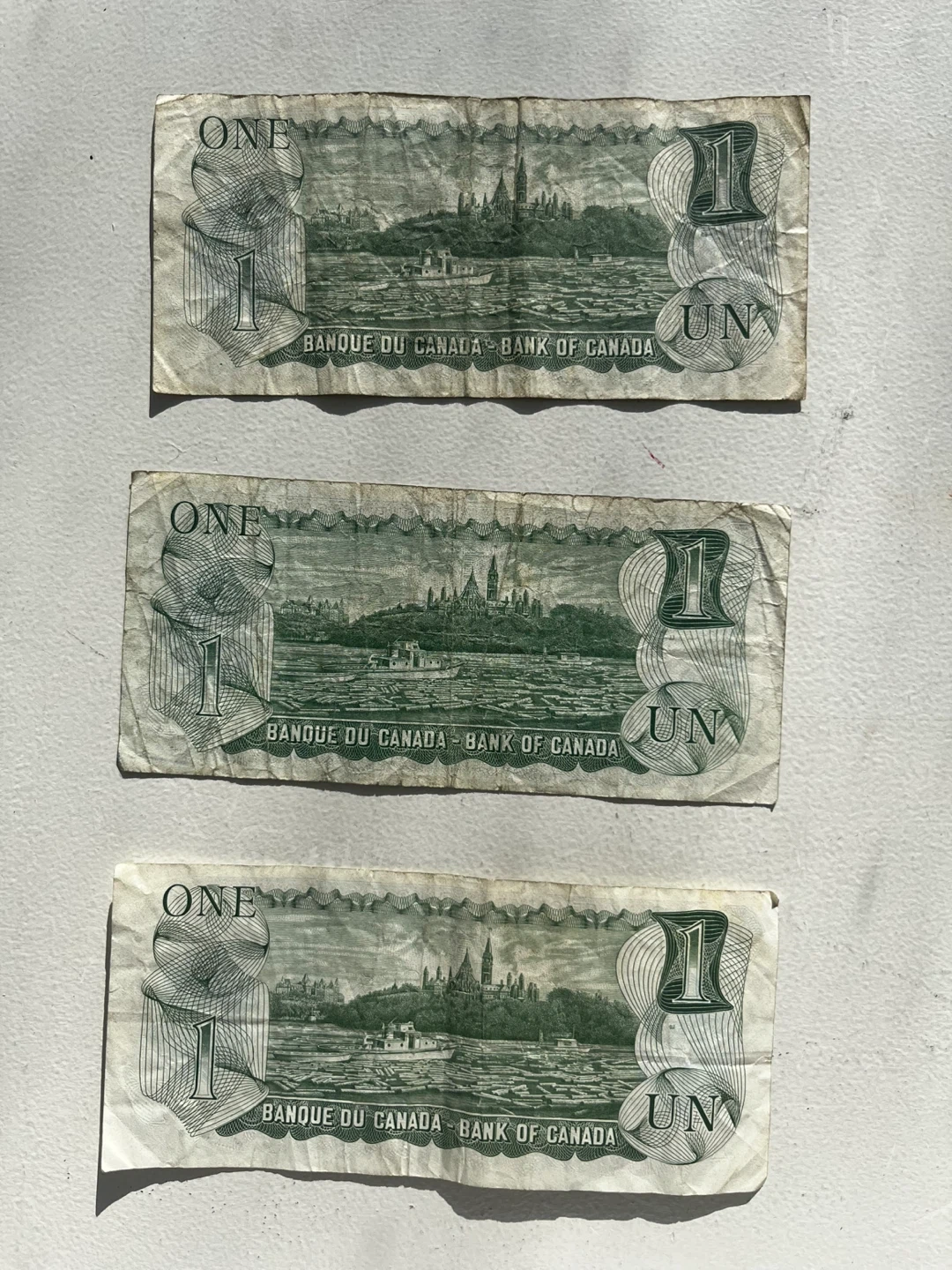 Three older Canadian one dollar banknotes from 1973. Features Queen Elizabeth II on the front and Parliament Hill on the back.