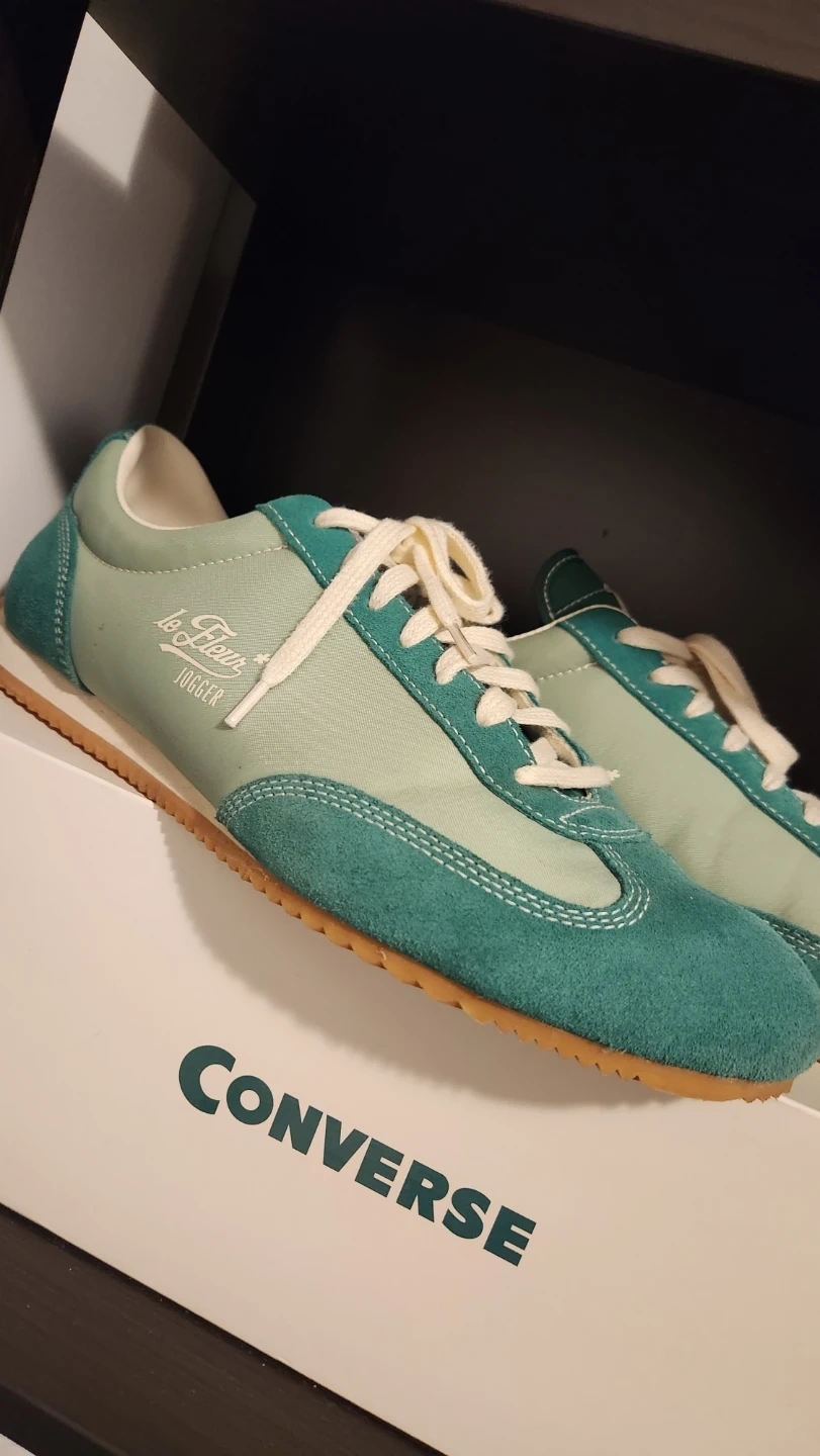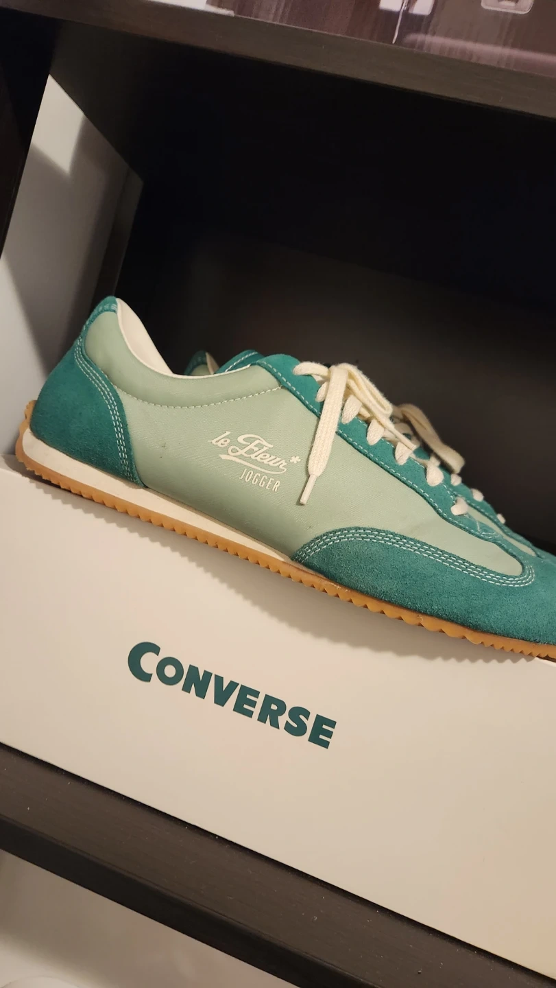 These are Converse Le Fleur Jogger shoes in a forest green colorway, worn a couple times, extra laces and box included with purchase, open to negotiations if needed.